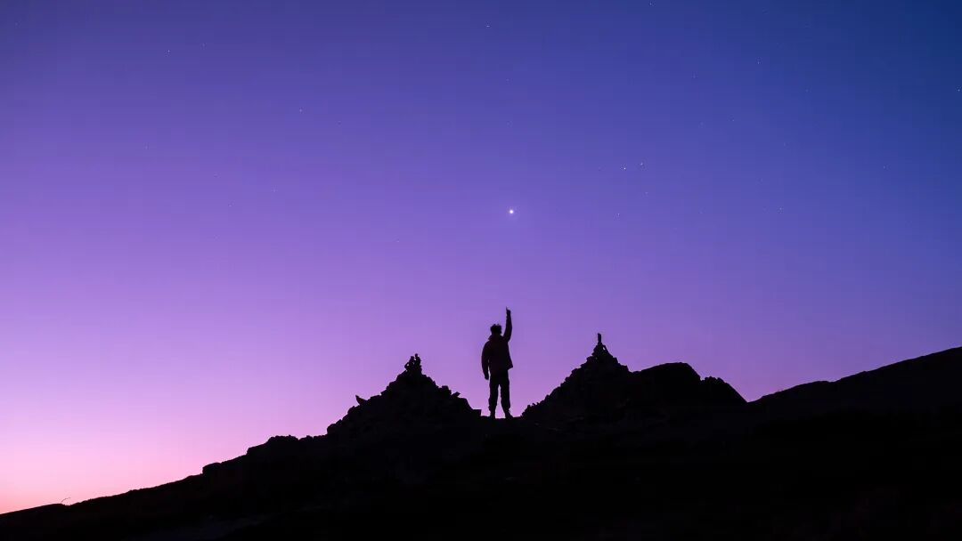 当金星领着火星和土星跃上山顶的玛尼堆时,太阳已然将天空渲染成了浪漫的粉紫色。