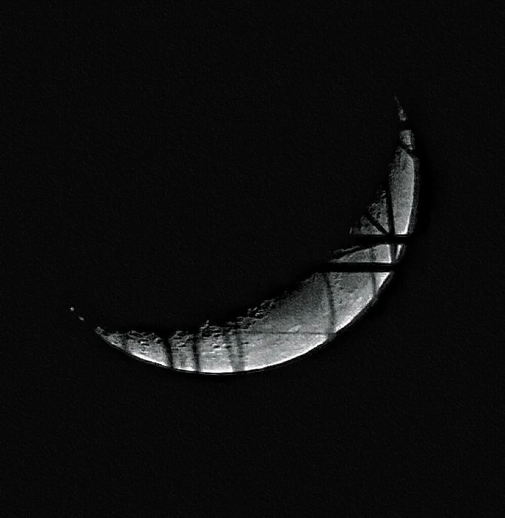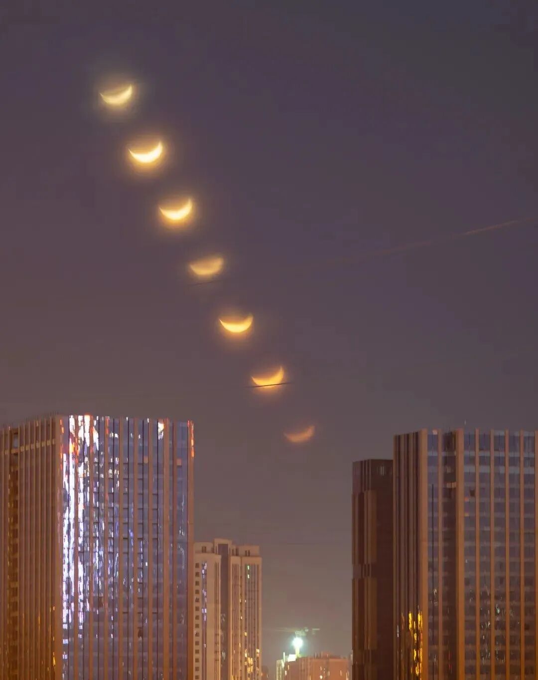 夜晚的春风吹着柳树来回摇摆,捕捉月亮下班时刻,不巧被柳树及远处工地吊塔遮挡,正好拍下这“残月”。