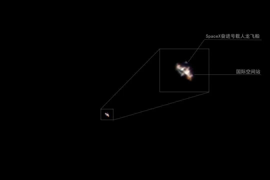 2022年4月9日19时23分,我用长焦相机对正在过境茂名的国际空间站进行手动跟踪拍摄,回去用电脑打开照片,惊喜地发现每一张连拍图像上国际空间站的旁边都跟着一个小亮点,上网一查发现那竟然是正在对接国际空间站的SpaceX奋进号载人飞船。