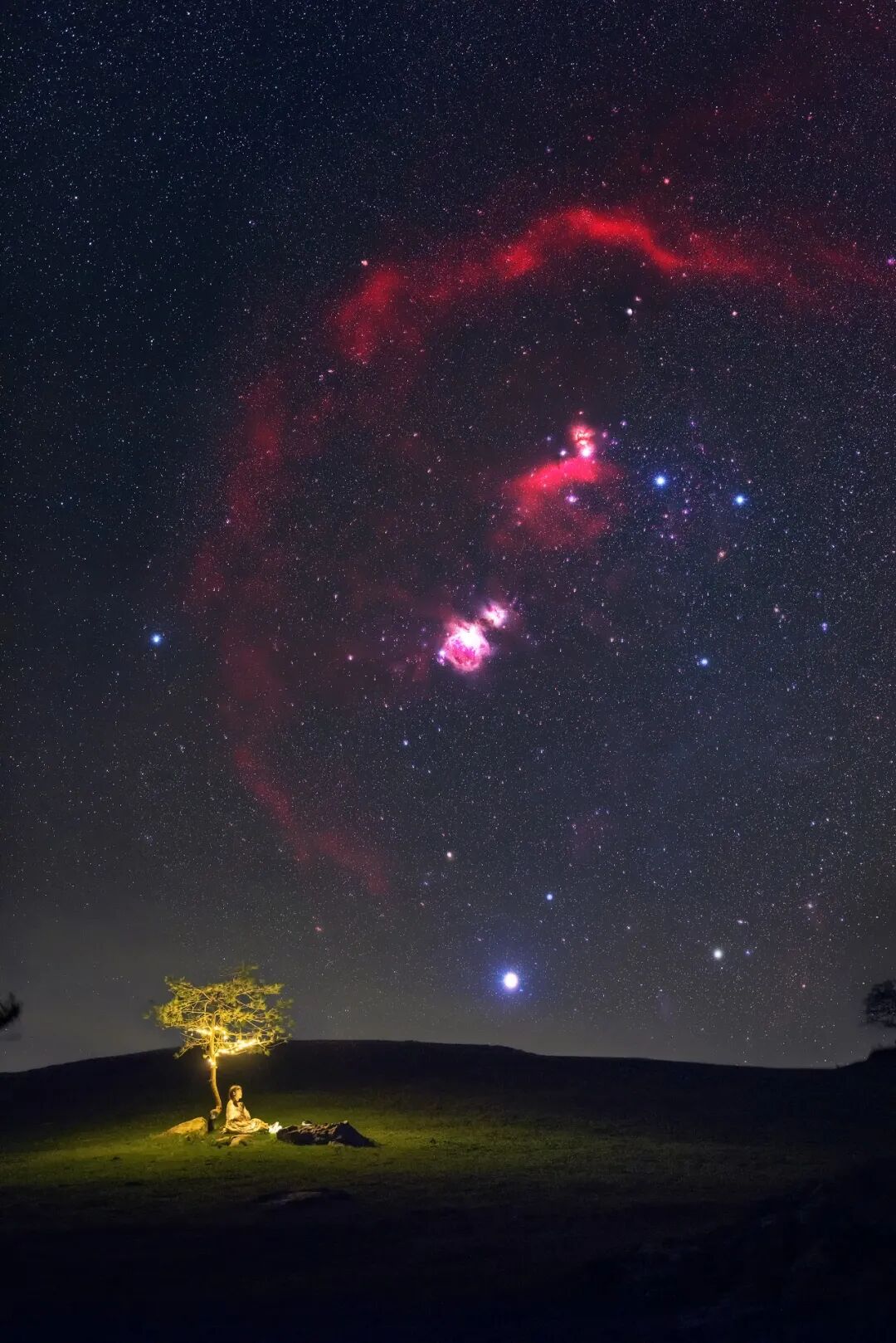 猎户座作为北半球冬季银河的绝对主角,拥有着猎户座大星云、马头星云、巴环等一众华丽的星云阵容。时间来到4月,已经到了猎户座拍摄的尾声,接下来它会在天黑之前就沉入地平线以下,再想要拍摄就要等到10月份左右了。在这个4月的夜晚,我来到菖蒲草原,挂上一串灯,坐在树下,欣赏正在离去冬季银河,告别美丽的猎户座。