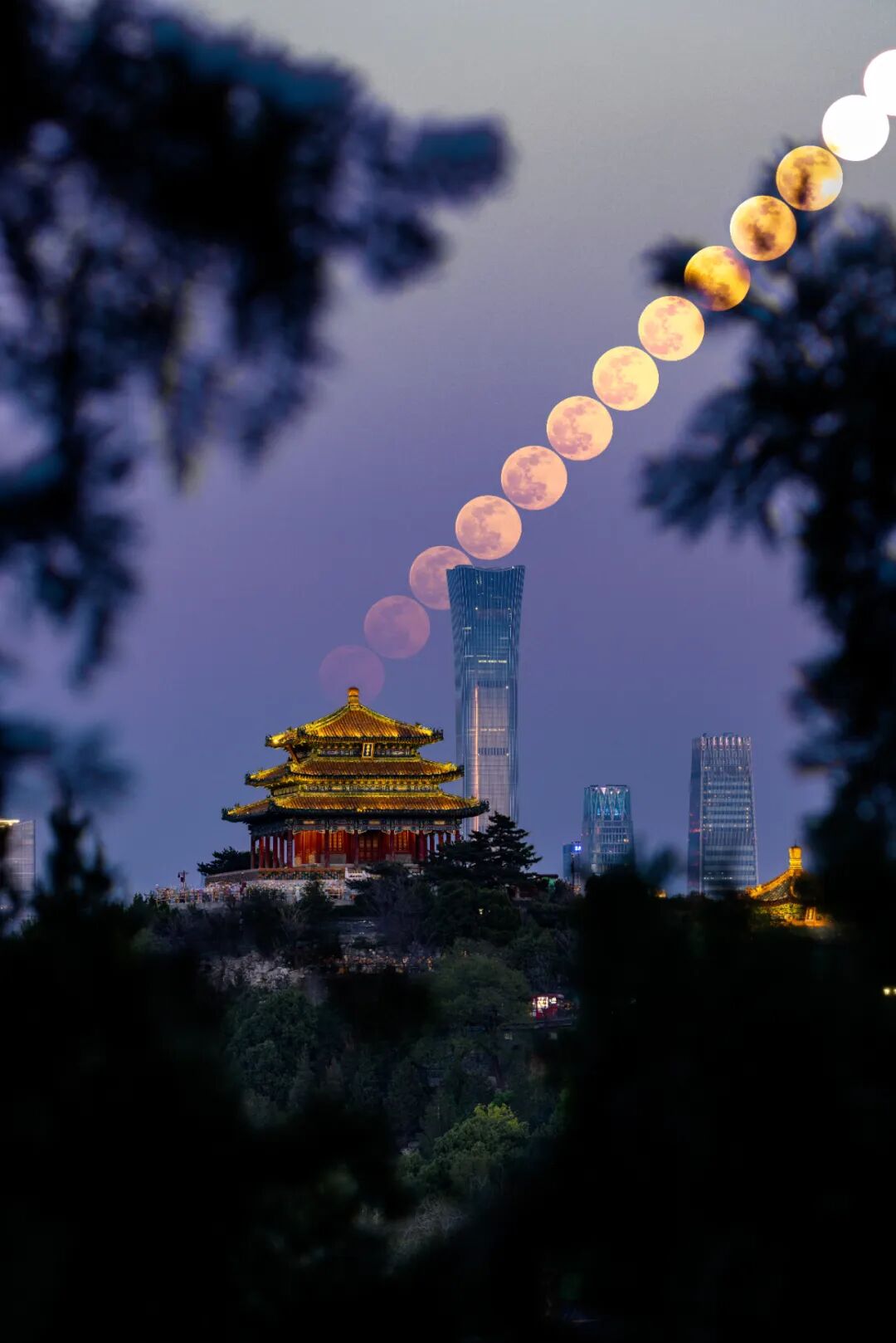 利用巧摄,发现在此位置,满月升起时先后掠过古老的景山万春亭和现代的中国尊,一月照古今。