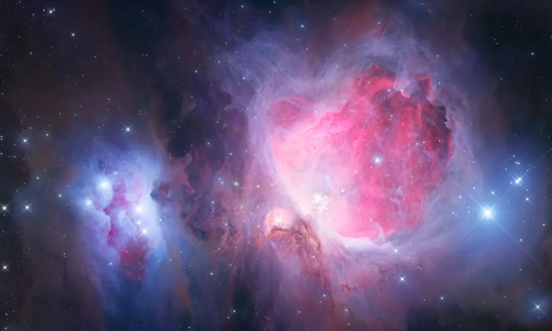 虽然M42一直都是深空新手目标,我还是想用半米镜拍摄一副高分辨率的且细节丰富的片子,于是做了一个两幅拼接的马赛克和核心区单张180s的HDR。但后期时我又发现一个问题:核心区如果全部压暗,附近就会显得有些假而且缺少立体感。在细节、真实程度和美观性这几个角度方面斟酌后,我还是决定让核心区适度过曝。有了自然点的亮度过渡,云气柔中有纹理,红色与蓝色的交织恰到好处,这才是我心目中的梦幻大星云。