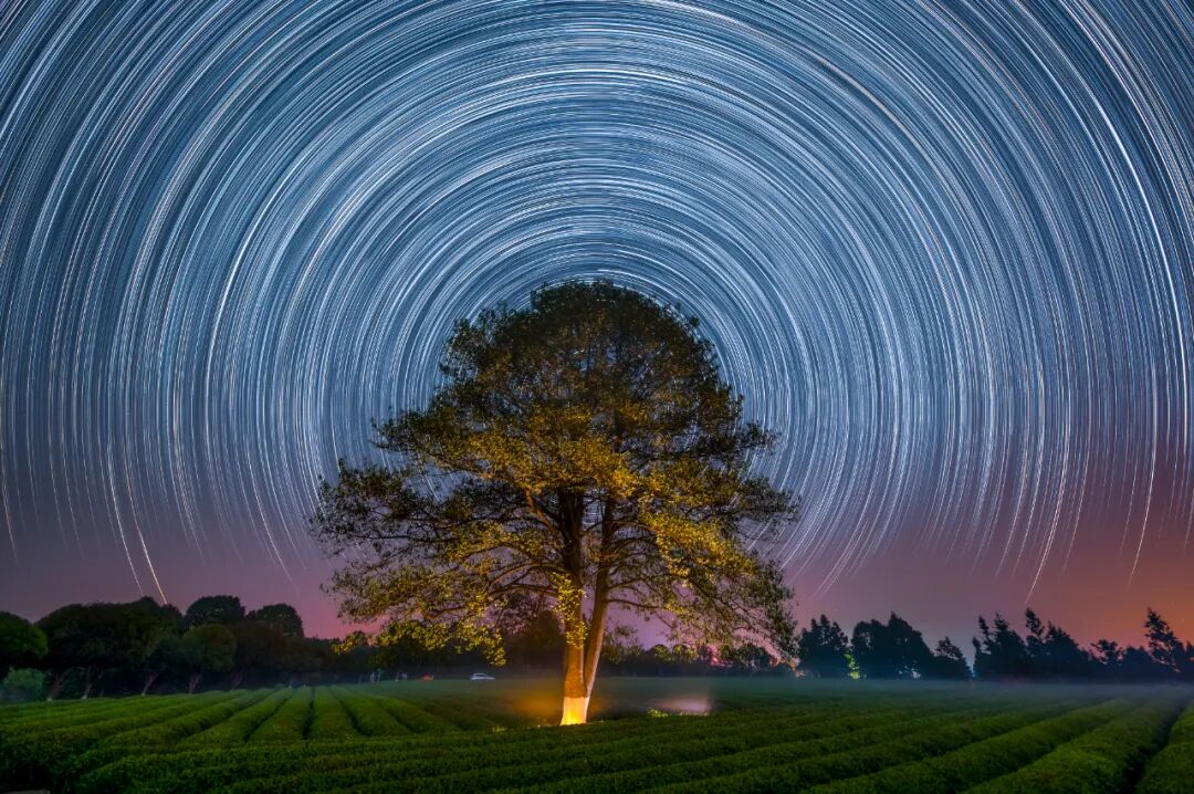 清明时节,满山茶叶开始长出嫩嫩的绿芽。清风掠过,漫天清新的茶香夹杂着春泥的芬芳瞬间氤氲着整个茶园。深夜,茶园上飘起一层薄薄的平流雾,像是给茶田蒙上了一层纱,园中恰好有一棵孤立的树,我便以此为前景创作了这张星轨。