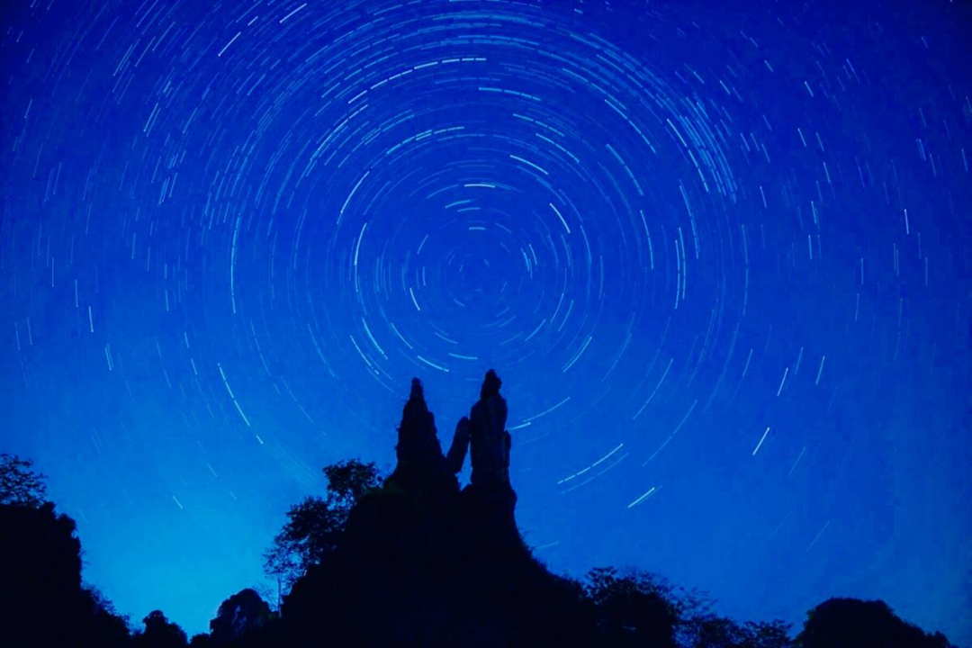 在世界地质公园兴文石海的茫茫石海地表,座座峰峦围绕着一处直插蓝天的俊俏石峰,这座石峰便是有名的夫妻峰。夫妻峰高40余米,距顶部约10米处峰体裂开,形成一高一低的对峙二石,如夫妻携手侃侃而语,又似在遥望天空纵情歌唱,便以此为前景创作了这张星轨。