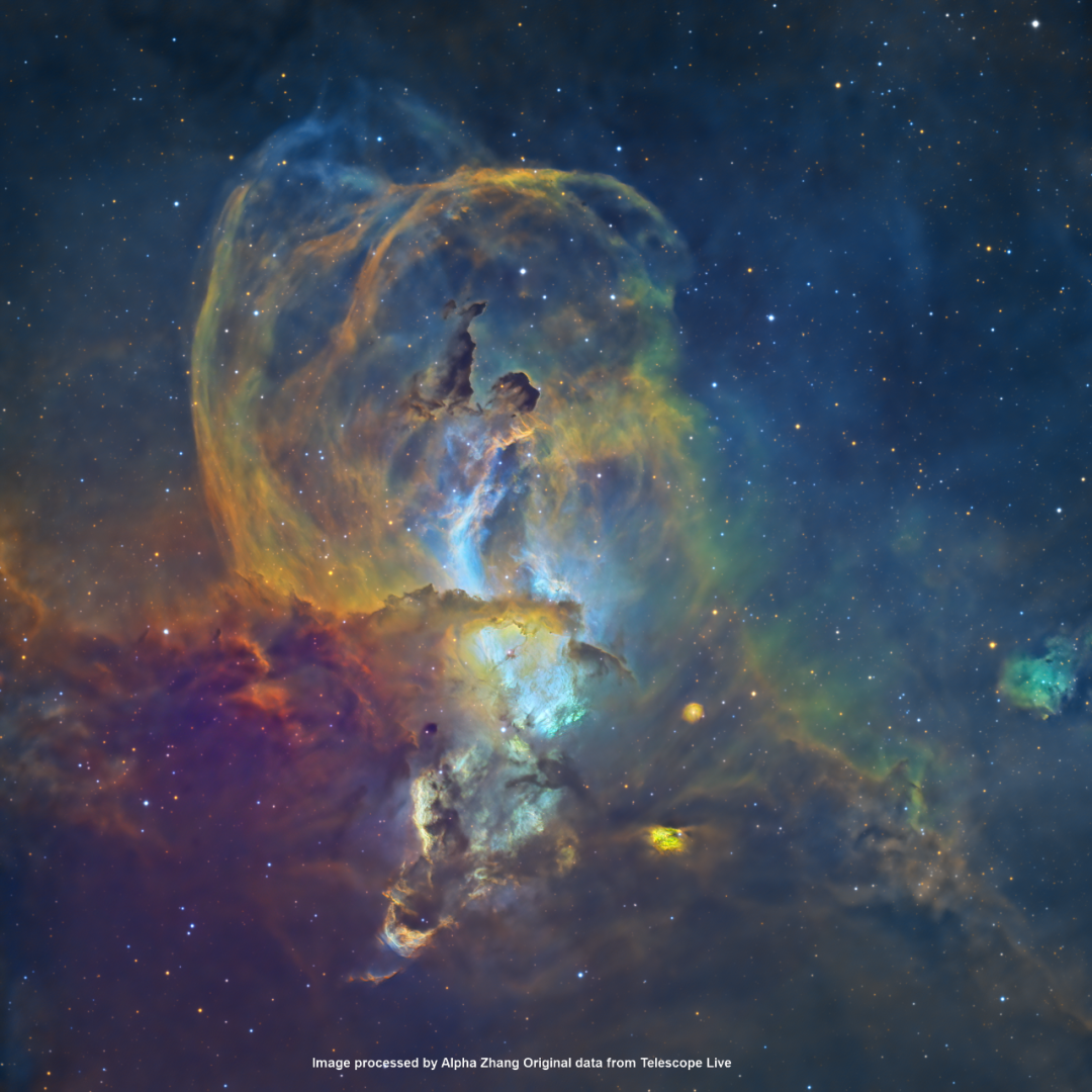 NGC 3576是一个位于船底座的小型发射星云,位于银河系的人马螺旋臂,距离海山二周围的星云数千光年。