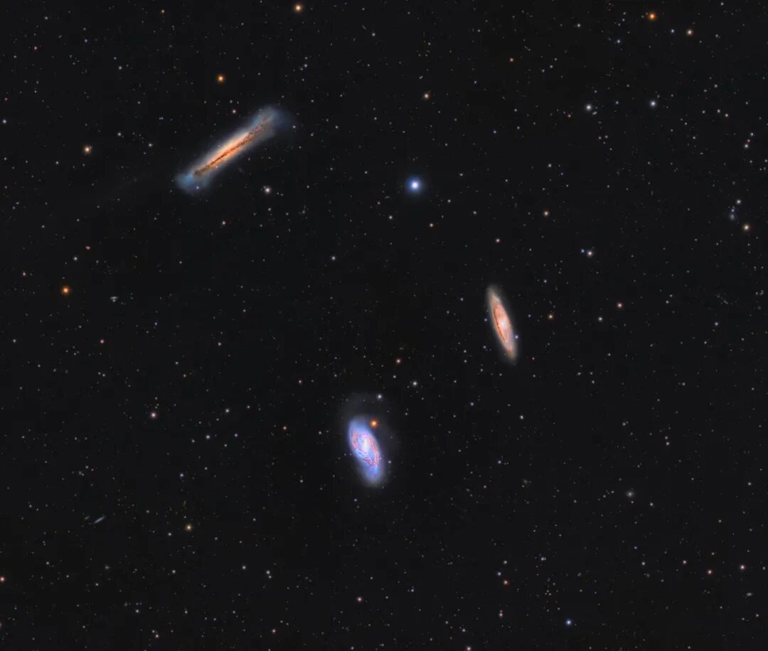 使用适合的望远镜可以欣赏3个聚在一起的美丽星系,这组星系分别命名为NGC 3628(上)、M66(左下)、和M65(右下),它们全都是大型螺旋星系。它们看起来形状不同,是因为星系盘面与我们视线夹角不同所致。其中,NGC3628是侧视,尘埃带切过星系的盘面,而M66和M65的倾斜度都很大,所以我们能看见它们旋臂结构。这组星系之间的重力作用造成了一些明显的效应,其中包括NGC 3628扭曲的星系盘,以及M66被拉长的旋臂。这幅壮丽的影像所涵盖的天区大约是一度(二倍满月的宽度)。这个三重星系跨度大约覆盖了50万光年的范围,估计距离我们约有3,000万光年远。