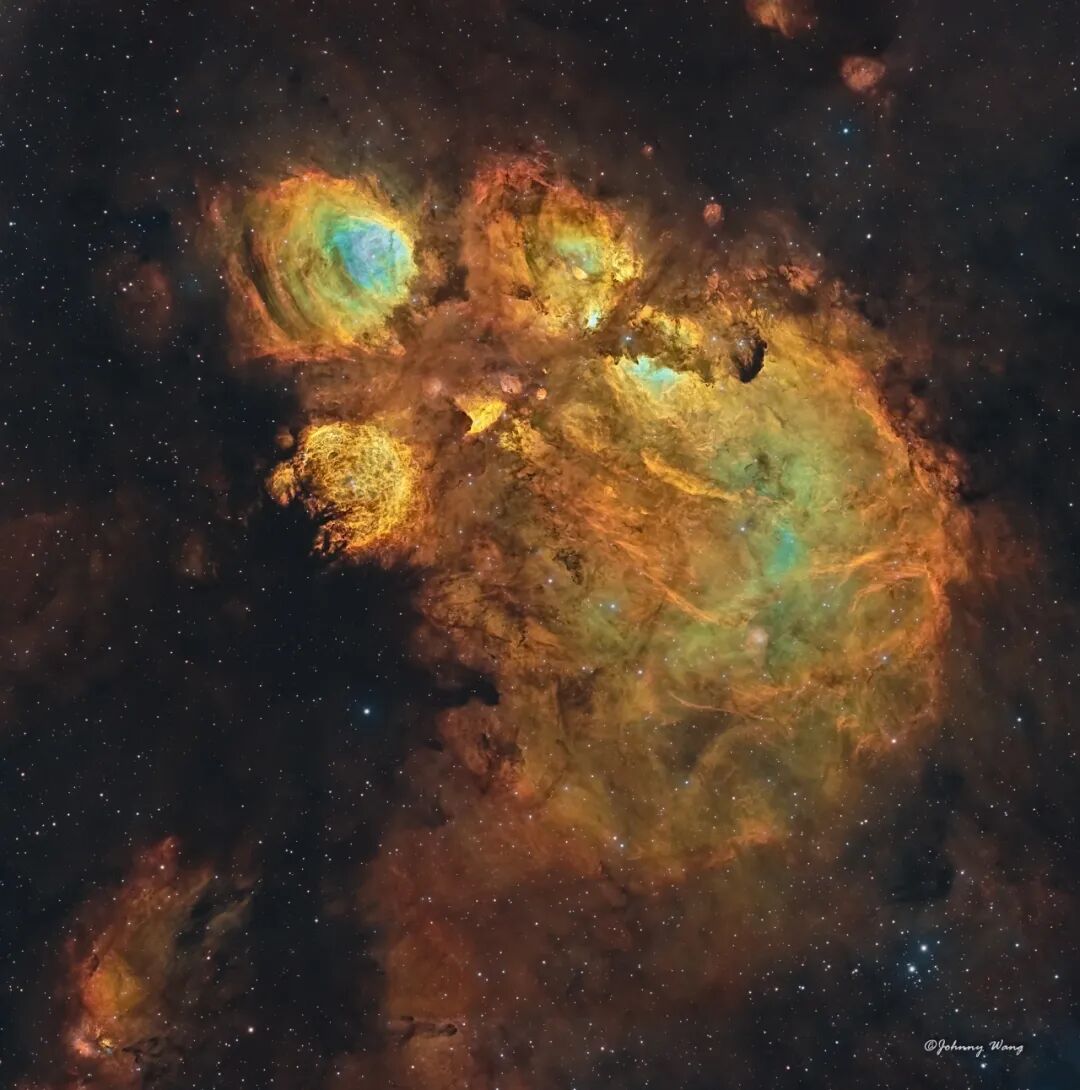 NGC6334猫爪子星云,只要想像力在线,你可以在银河系(包括大小麦哲伦这种银河的伴星系)中找到很多各种形状的星云,这就是宇宙的奇妙,当然在河外星系中一定有更多奇妙的星云,只可惜太远了我们很难分辨它们的形状,不过你要相信,在某个星系里,一定有长得像你的云气。白话了半天,这只巨大的比熊掌还大的猫爪子,位于天蝎座,离我们5500光年远,横跨了50光年的范围,比满月还大的天区。它可能是银河系最活跃的恒星诞生区之一,内含刚出生数百万年的年轻蓝色恒星,质量比太阳大10倍以上,它左边的丝网状的小趾头,是濒死的恒星在向宇宙空间大量抛售物质,它可能已经死了,我们只是看到了它生前的影像。