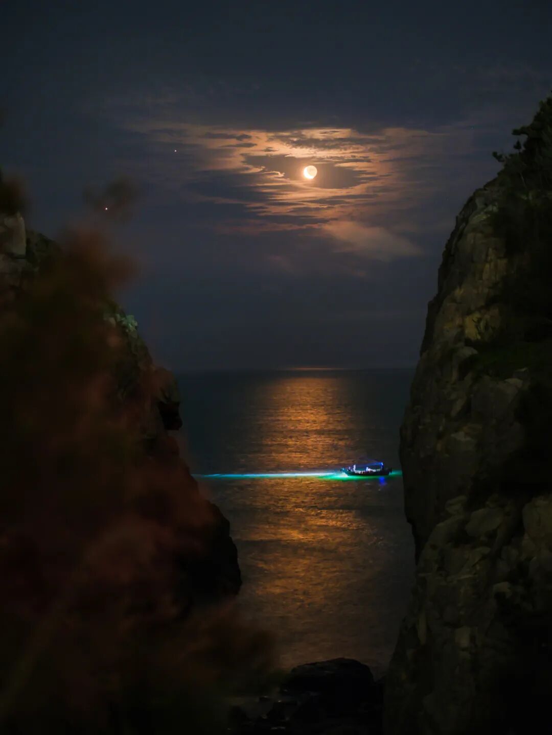 福建福州平潭仙人井景区仙人谷中,新月穿过云层,如月神之眼凝视大海。海上渔民起早贪黑,渔船灯光与月色融为一体。