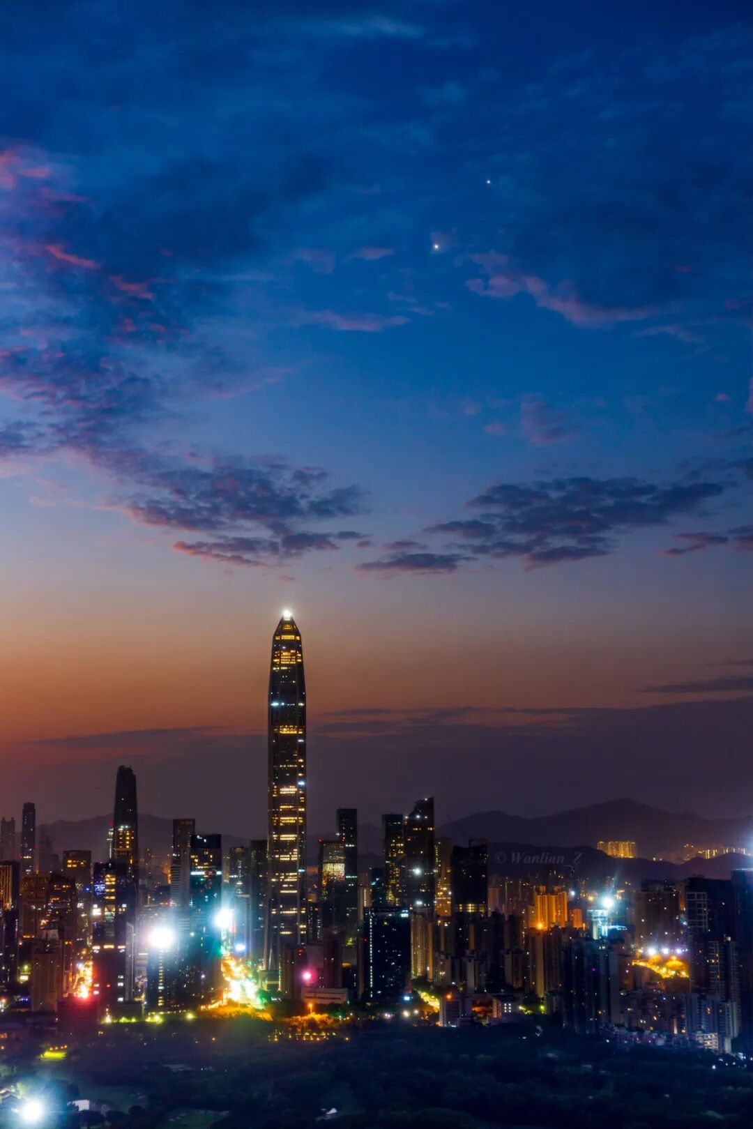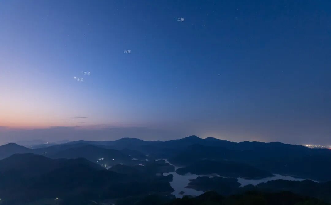 静谧的早晨,城市灯光仍未熄灭,曙光渐起。金星和木星如宝石一般挂在深蓝色的天空中,为早起的人们送去光芒。