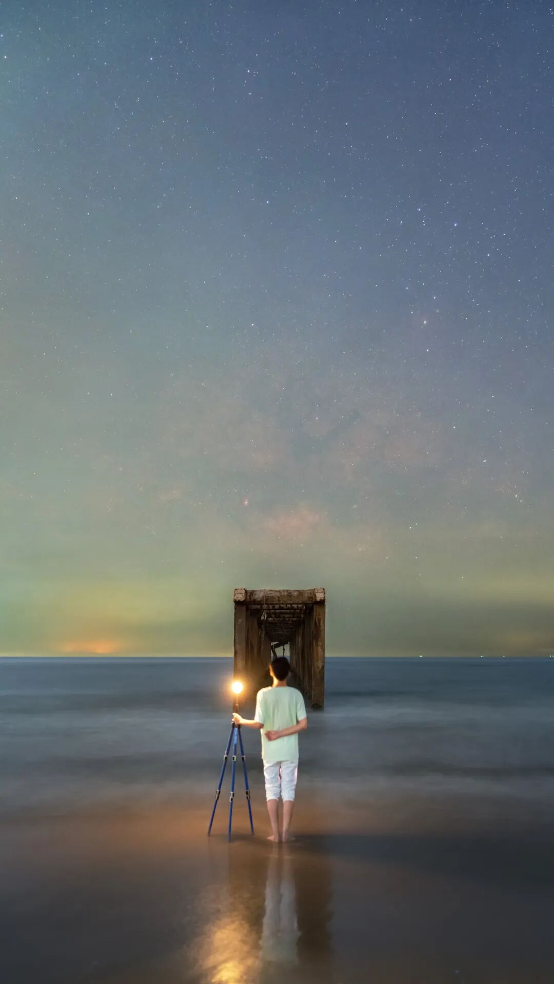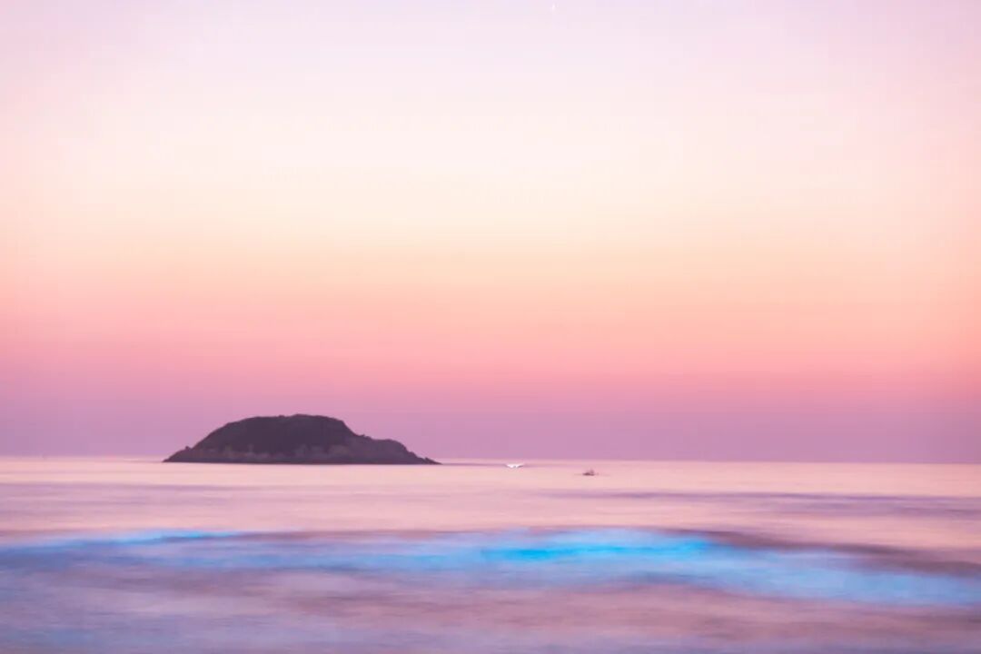 拍摄荧光海到天亮,偶遇日出前的朝霞,整夜的荧光海到天亮实属罕见,抬手便拍下这美丽的画面。