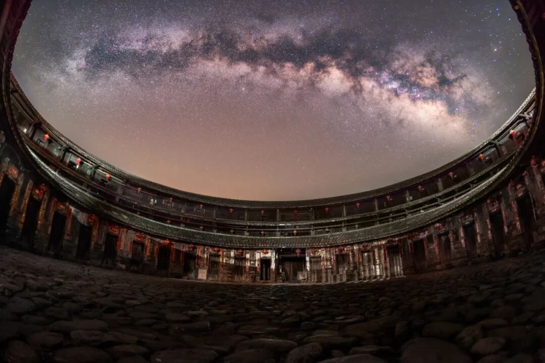 “神之围楼”的星空,银河高高悬挂却又被土圆楼所包裹,相辅相成。