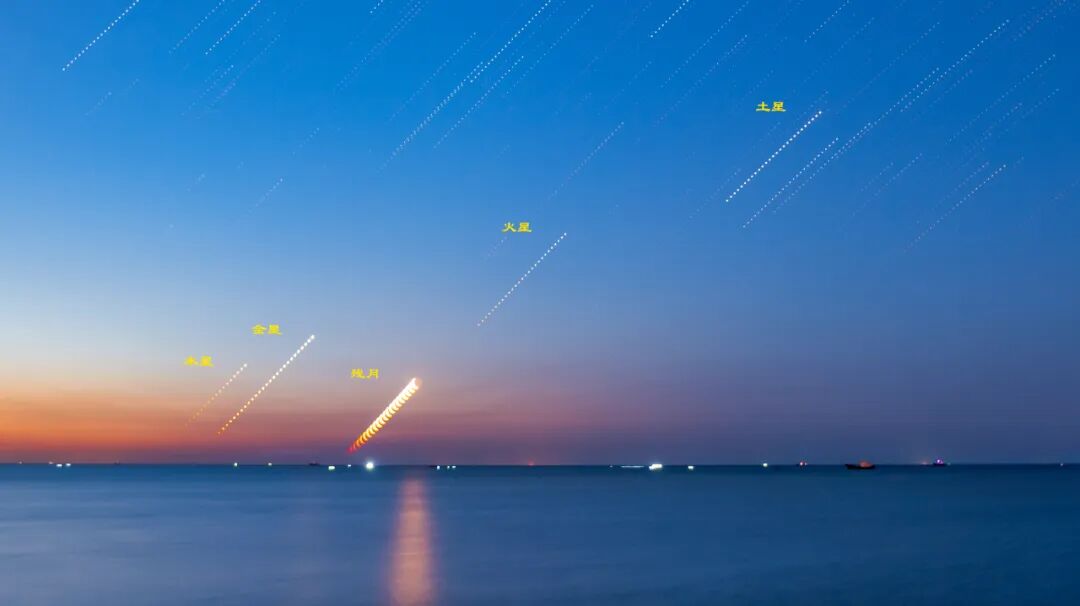 四月下旬黎明时分,木星、金星、火星、土星四颗行星排成一条直线,形成四星“连珠”天象。24日之后,一弯残月也运行到黎明东方天区,与四颗行星依次相伴。原计划从24日开始拍摄,怎奈潮湿、雾霾、大风、沙尘天气一应俱全,无法清晰的看见星空。27日凌晨,终于等来了一股冷空气,吹散雾霾,打开凝望宇宙的窗口,拍下这个有趣的天象。