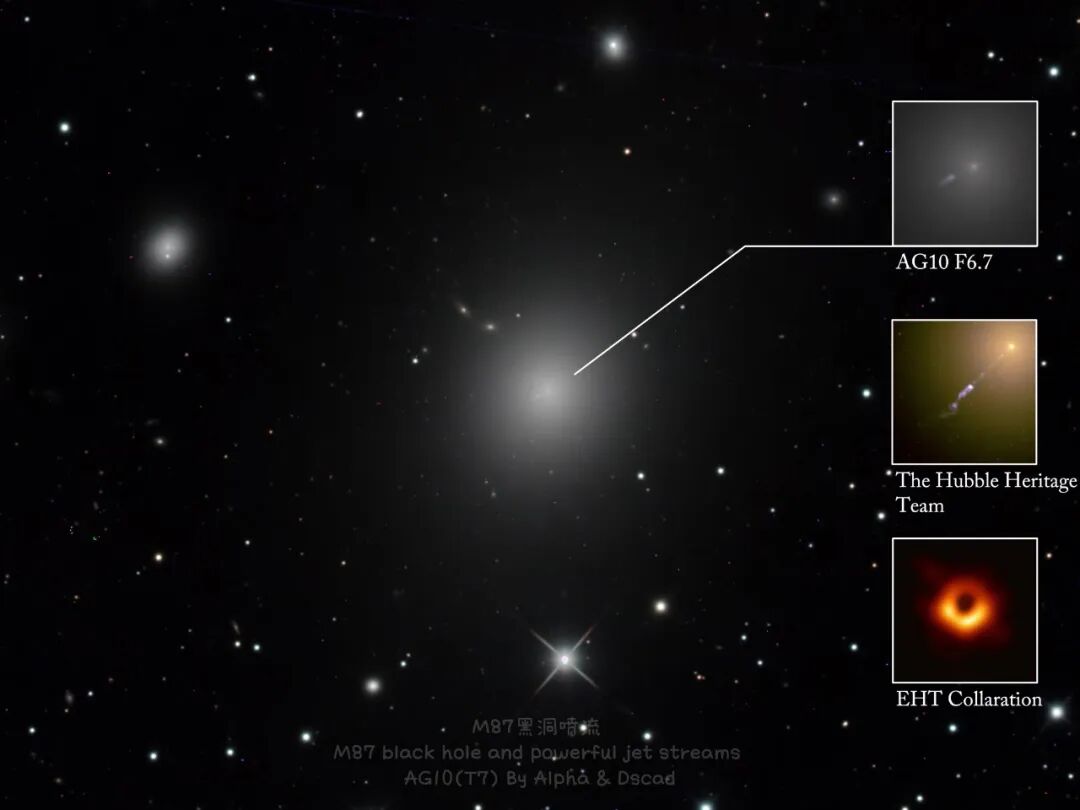 M87是巨大的椭圆星系,也是银河系附近几个质量最大星系其中之一,该星系由核心发出一道向外延伸约1,500秒差距(4900光年)的高能等离子喷流,运动速度达相对论速度,与光速已相当接近。组成物是一个超大质量黑洞所喷发出来的物质。此喷流呈现高度准直性,喷流能量可能来自一个以顺向盘旋于一个自旋黑洞的盘。