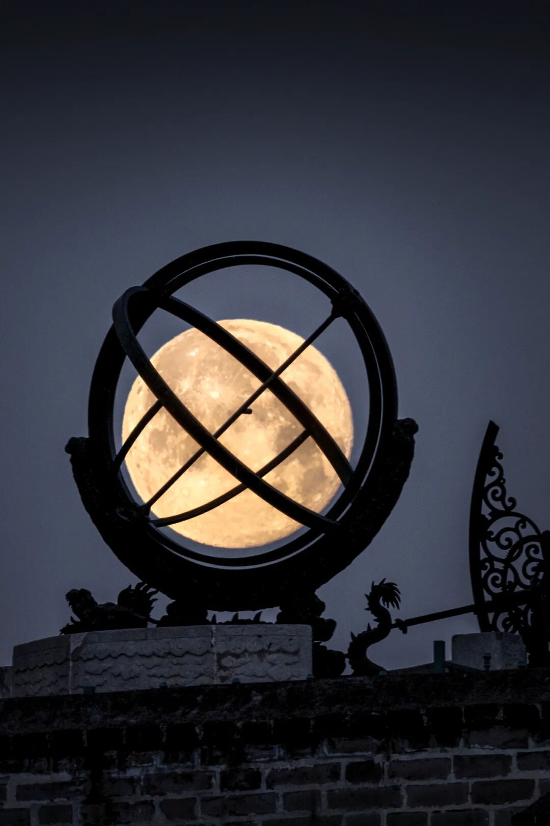 北京古观象台是世界上现存最古老的天文台之一,也是我国明清两代的皇家天文台,连续从事天文观测近500年。它以建筑完整、仪器配套齐全、历史悠久而闻名于世。这张浑天仪悬月的照片拍摄于清晨月落之际,我将这张古今交融的照片命名为《观月》。