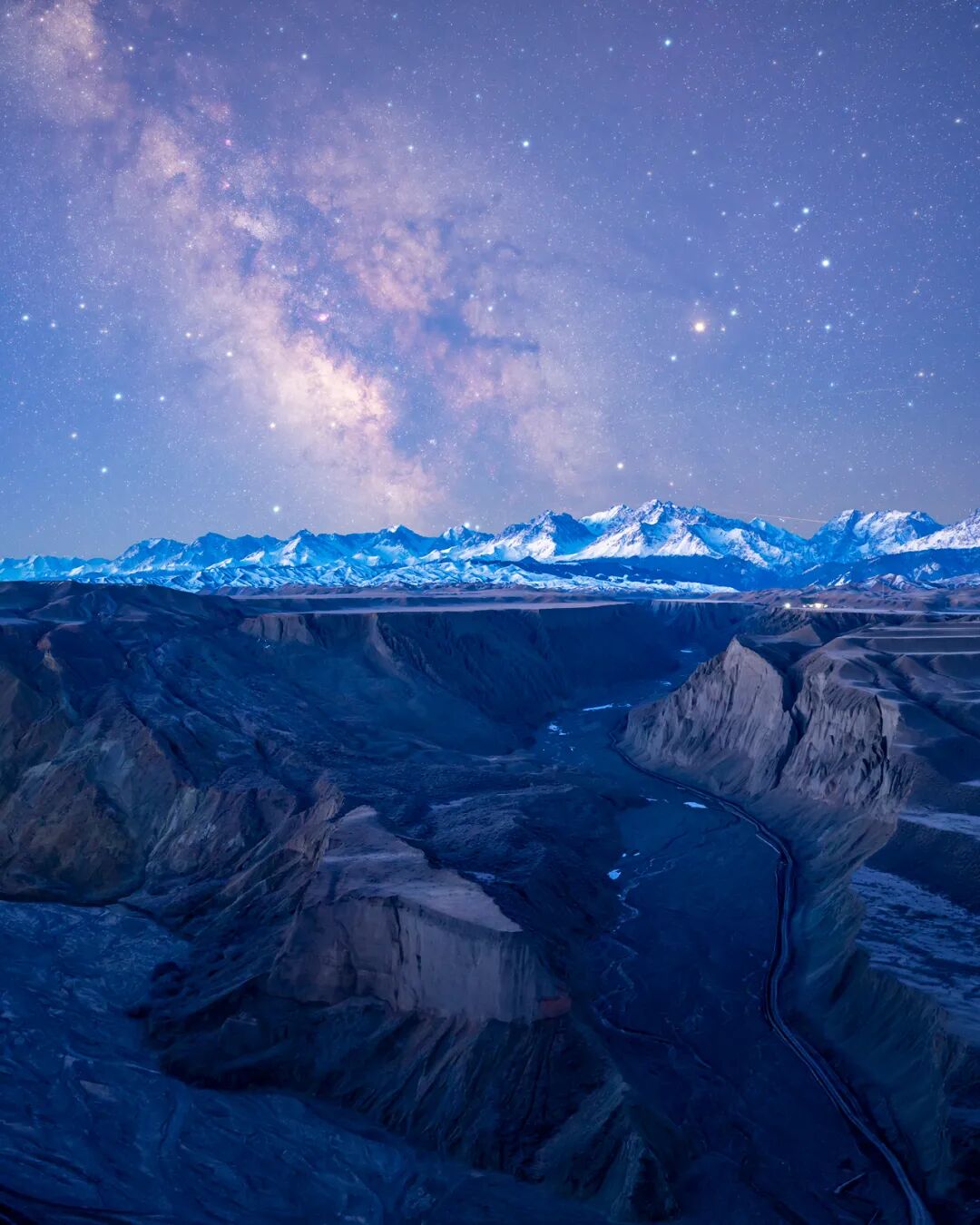 峡谷,雪山沟壑着地球的历史波纹,蓝调时刻的星空银河升起在雪山之上调制出蓝调烂漫。