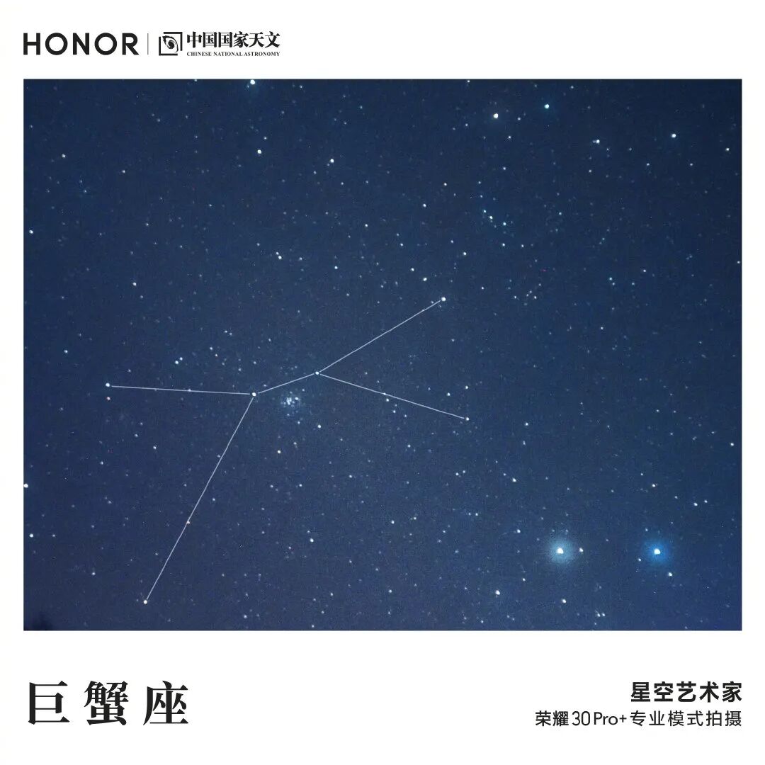 比起左右明亮的双子座和狮子座,巨蟹座是黄道十二星座中最暗的一个,3颗较亮的恒星巨蟹座α、β、δ组成了“人”字形结构。除了天秤座,十二个黄道星座大都象征着有生命的人物或者动物,或许这也是为什么古希腊人将它们称作“兽圈”的原因,你可以将它们看做“天上动物园”。