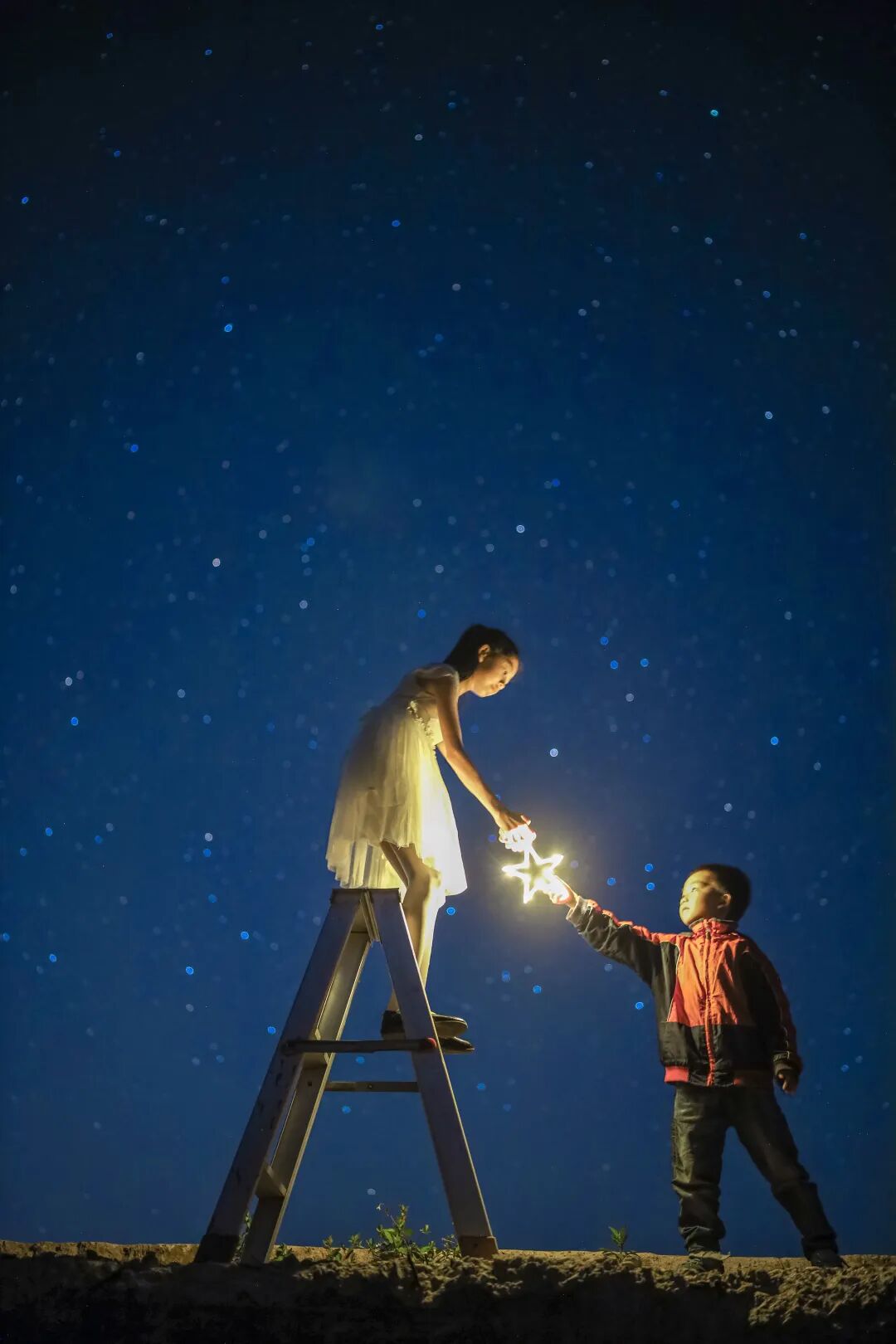 出发拍摄星空前,突发奇想带上一把梯子,尝试着看能不能拍摄一组孩子爬梯子摘星星的画面。片子出来后感觉还可以。让孩子们在夏天留下美好的回忆。