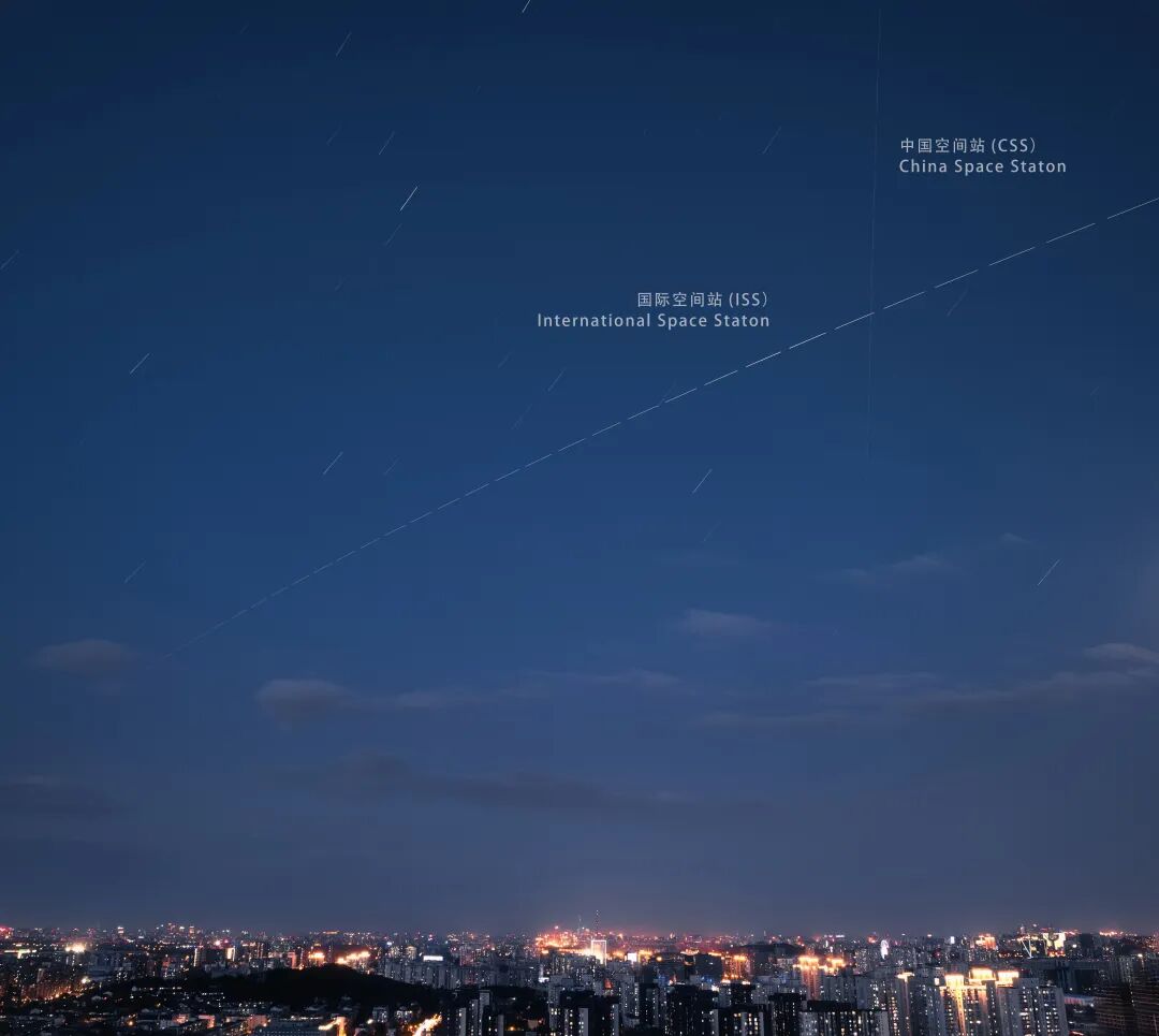 2022年5月15日,晚上8点前后,中国空间站与国际空间站在济南经十路的上空划出一个有趣的“X”。
