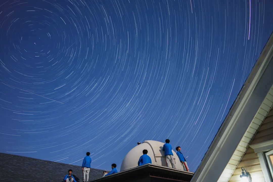 在广东信宜毛竹林场的山顶观景平台上,有一个亭子,眼看着北斗七星正指着塔尖上,我把它拍下了做成星轨。在中国,同心圆还含有美好的寓意,象征圆满、美满、以和为贵。
