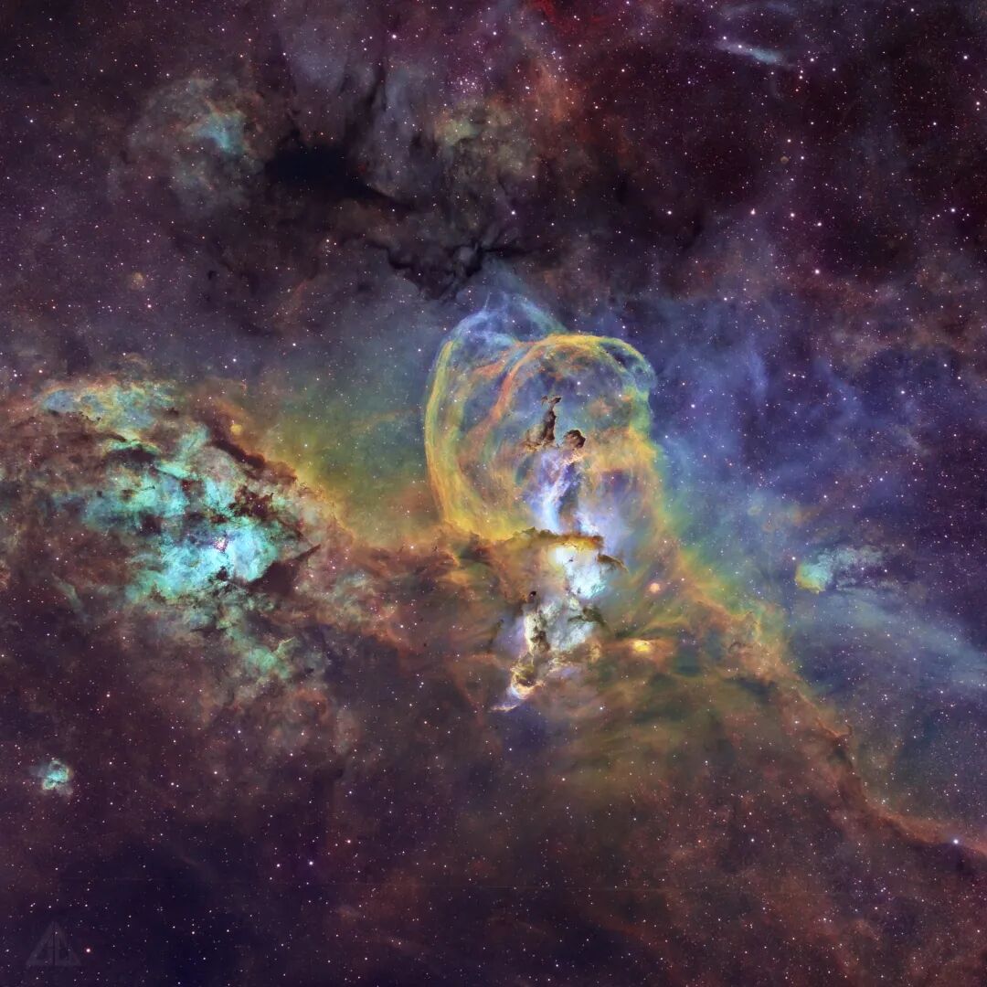 NGC3576是一个位于船底座的小型发射星云,位于银河系的人马螺旋臂,它的直径约为100光年,距离地球9000光年。这个星云甚至有六个不同的分类号。目前,天文学家将整个星云称为NGC3576。由于星云中间独特的形状,所以有一个流行的绰号叫“自由女神星云”