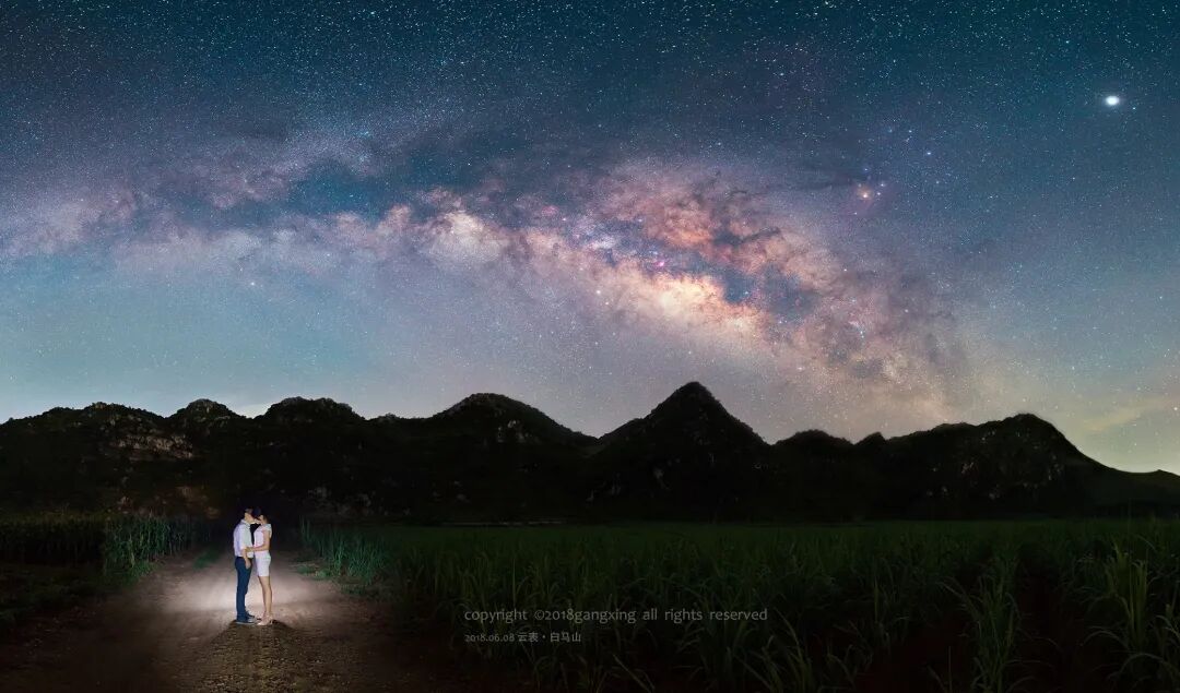 在2021年英仙座流星雨期间,我们驱车和乌云赛跑,寻找拍星地。一路都下着大雨,终于在到达青海后,才得以避开川西的坏天气。此时也正值七夕节前夕,我让我的朋友夫妻俩站在星空下,给他们拍下了这张合影。流星与银河,在时间维度上,是瞬间与永恒;宇宙与人,在空间维度上,是宏大与渺小。在星如雨坠的时刻直面宇宙,是否更能理解爱情的意义?