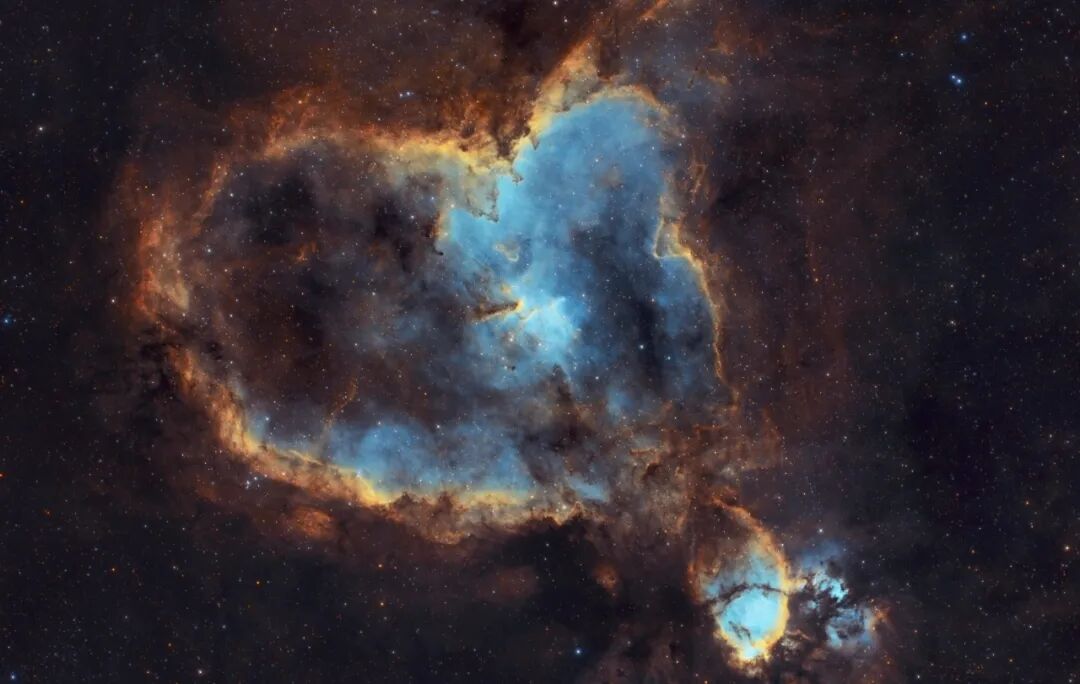 位于M字型的仙后座区域中,有一个心脏型的发射星云编号为IC1805,距离我们大约6500光年,由于其造型独特,以及Ha Sii Oiii等窄带波段中含有丰富的信息,所以可以调出冷暖大对比的“哈勃色”,深受深空摄影者们的热爱,是最热门的目标之一。