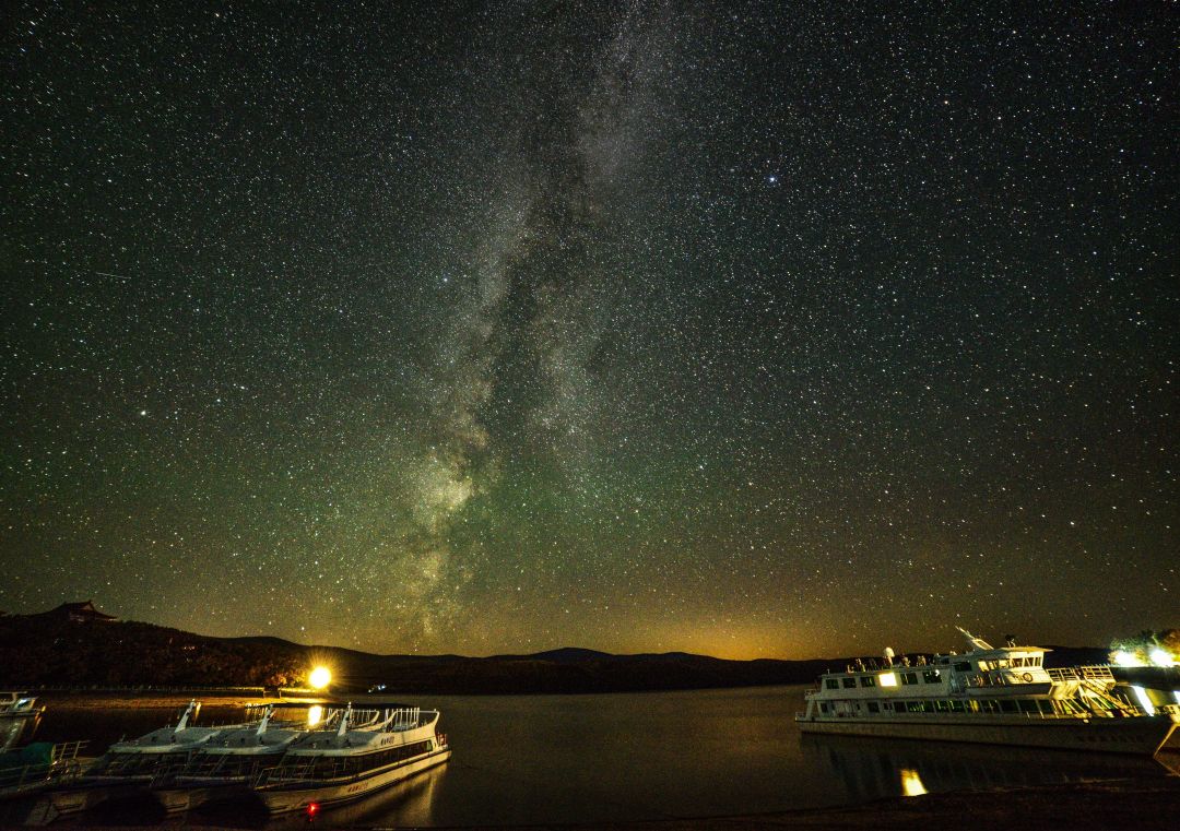 镜泊湖白天游人如织……一直想拍静与泊的画面,肯定得是夜景星空了,这秋季银河竖降湖中,借古诗曰:“醉后不知天在水,满船清梦压星河。”