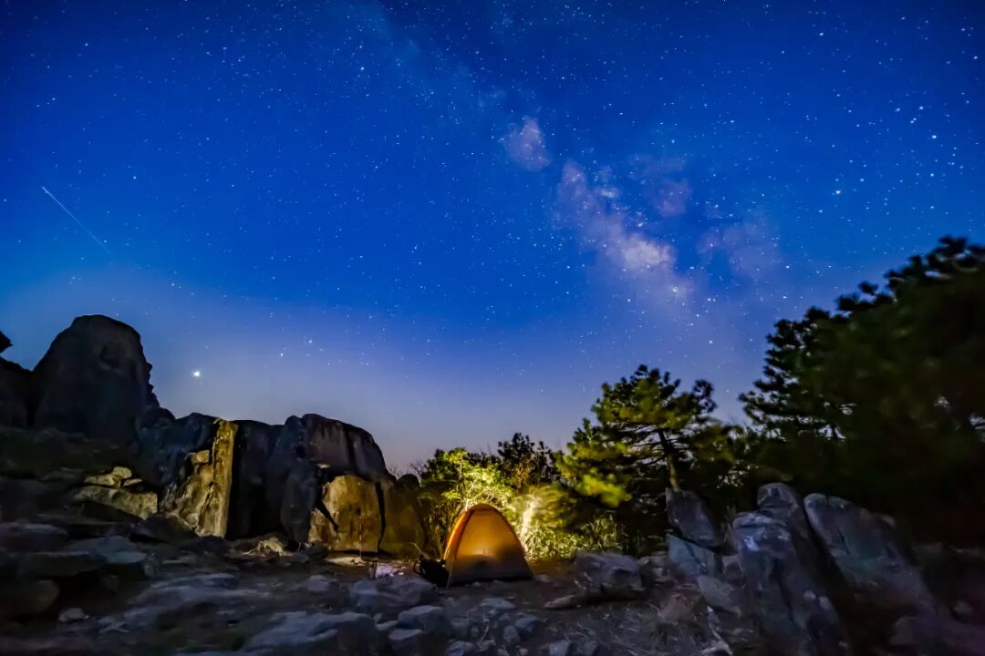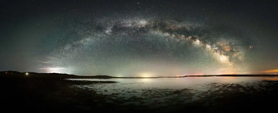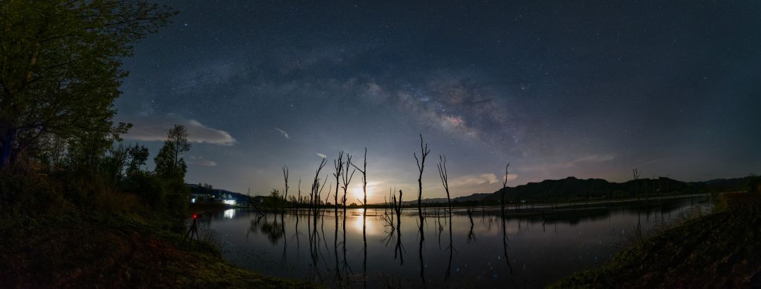 入夜,银河渐起。天幕之上是璀璨星河,地平线上泛着城市辉光,两者交相辉映,伴着湖面上青蛙、鸟儿的夜间啼唱,组成一首温柔的入眠曲。
