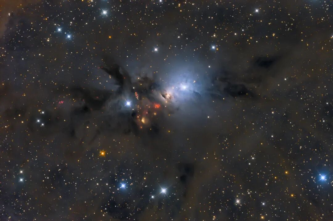 这是一个位于英仙座的反射星云,编号NGC1333,又称胚胎星云、幻影头饰星云。NGC1333的星际尘埃云在其内部数百颗年轻恒星的光芒照射下显现出泛蓝色光晕,衬托出星际尘埃云的形状。泛蓝色光晕在端部特别的明亮,使其看上去似乎像一只在英仙座空旷黝黑星空中飞翔的萤火虫。