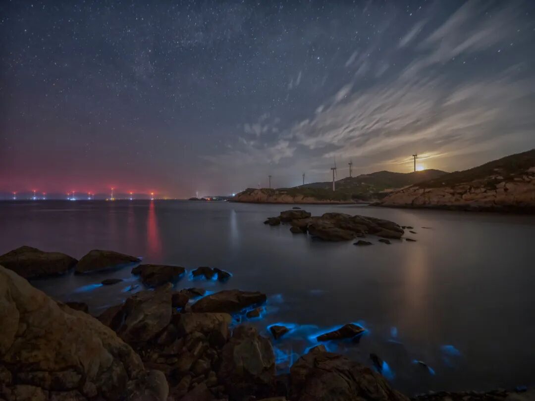 四月份,福建福州平潭蓝眼泪爆发。照片摄于平潭玉堂村。明月初上,云层渐散,月亮之上的璀璨银河与月光之下的梦幻蓝眼泪交相辉映。