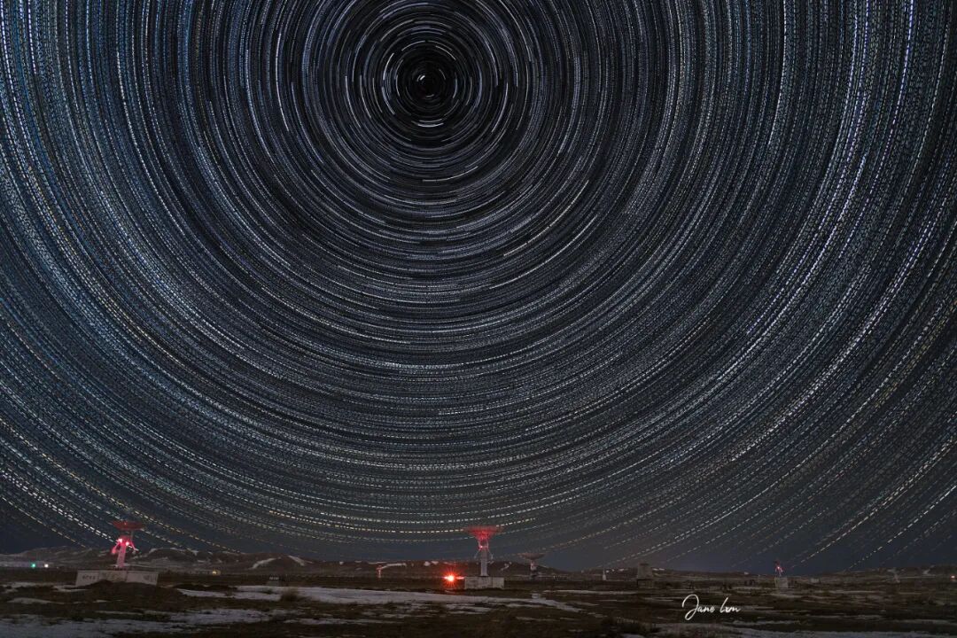 《三体》是我最喜欢的科幻小说,如何使用星野摄影的方式表达三体中大刘的脑洞是我一直想尝试的。于是在明安图拍摄象限仪座流星雨时,尝试拍了另一幅星轨作品。前期按照正常星轨拍摄方式完成拍摄,后期时将“不要回答”翻译成摩斯码,将摩斯码间隔对应的单张照片剔除,使星轨形成断点,堆栈后便形成了这张“不要回答”。