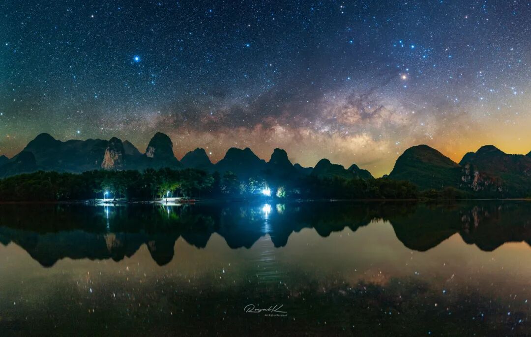 杨堤码头是漓江进入阳朔后的第一站,也是漓江精华山水风光的起点。若不是因为疫情,这个小小的码头白天会游人如织。不过,少有人知道这里光污染较小,夜晚的星空非常美丽。半夜,银河缓缓升起,点点星光倒映在漓江中。