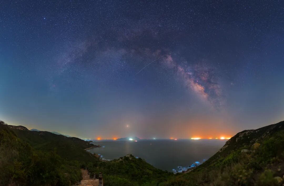 在深圳的6级光污染与探照灯下,遇到难得一见的荧光海与银河,一整夜无云,等待启明星升起,拍下了这片景象。幸运至极。