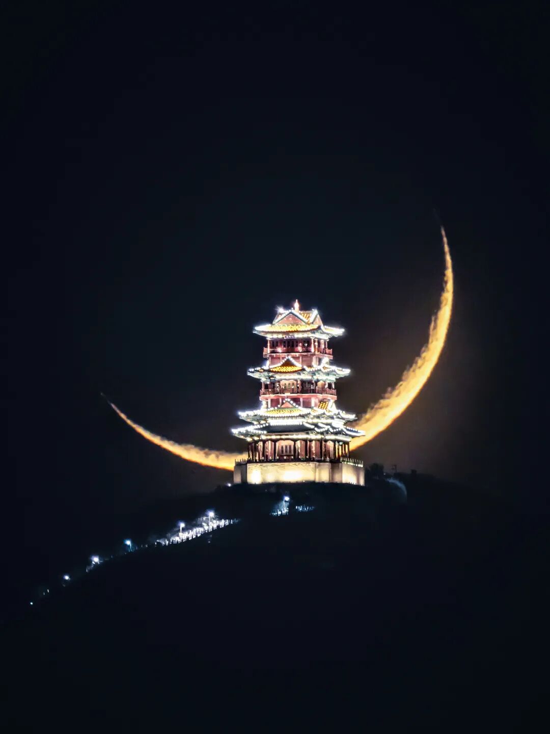 这张照片使用超长焦镜头拍摄于2022年2月3日,需要使用巧摄提前测算。照片中的古建筑是位于北京西郊的著名地标“定都阁”,这张照片很好地重现了南唐后主李煜的名作《相见欢》开篇第一句“无言独上西楼,月如钩”所描绘的意境,是我期待已久的画面。值得一提的是,北京定都阁平时极少亮灯,拍摄这张照片时恰逢北京冬奥会,因此我非常幸运地拍到了亮灯的定都阁悬月。