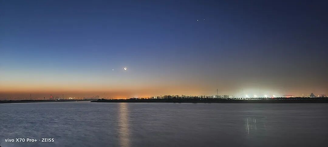 凌晨的蓝调时段,一轮残月升起在海河上空,金星相伴左侧,木星和火星默默出现在右侧。一条大河总能世世代代滋养一方土地及土地上的人民,伴着他们兴起、发展、繁盛、衰落,周而复始。河水静静流淌,散发着那种历经沧桑后的从容大度,大美无言。