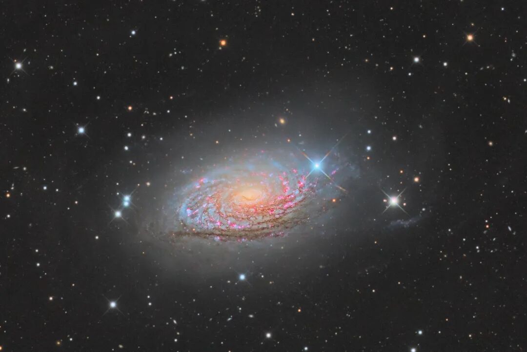 向日葵星系位在北天星座的猎犬座内,是夜空中较明亮的螺旋星系之一,用小型的望远镜就能够加以观测。在上面这张M63的照片里,可以看见发出蓝色辉光的年轻亮星所描绘出的细长弯曲旋臂、因游离氢气而发出红色辉光的发射星云、以及数量众多的黝黑尘埃带。