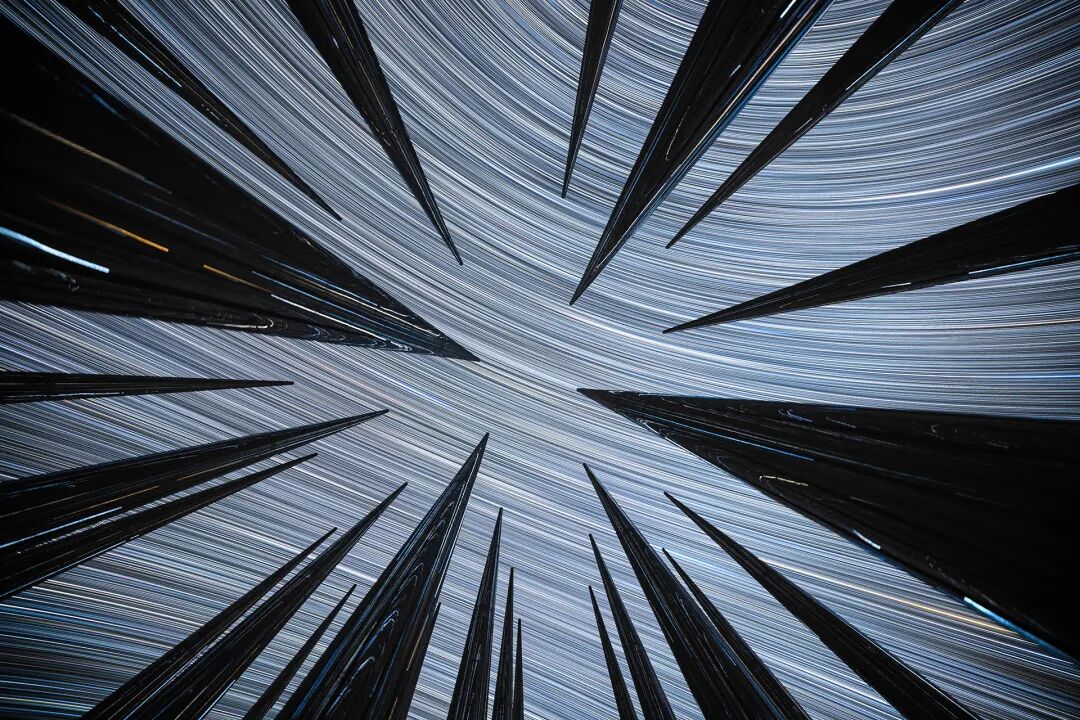 在大漠中,当夜晚降临繁星闪烁,点点星光倒影在金属雕塑上,一根根立柱犹如生长的触手伸向星空,而星轨也在金属柱身上留下倒映的痕迹,似乎还有淡淡的颜色,科幻感十足。