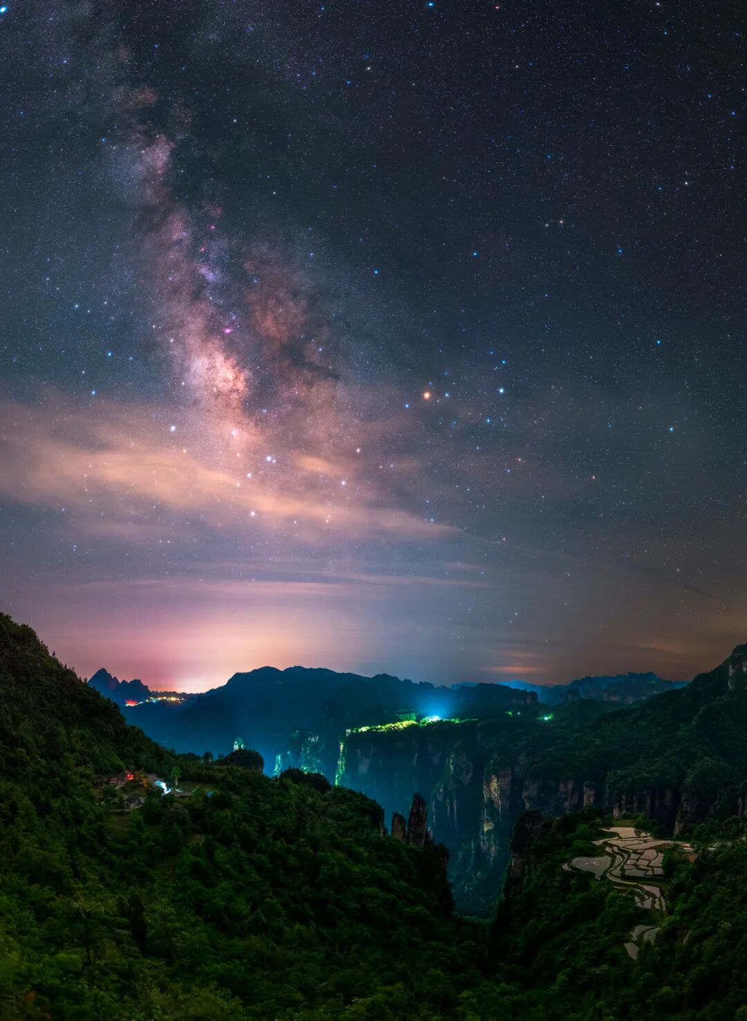 银河下的张家界空中田园,坐落于垂直高度300米以上的石英峰林悬崖边,倒映着银河里的点点星光。
