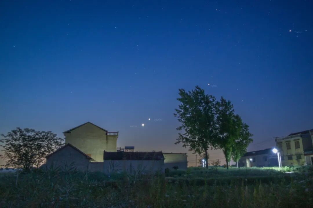 日出之前,东方既白,金木火土四大行星沿着黄道线依次排列,其中金星和木星两颗夜空中最亮的星(除了月球)也是极度的接近,就像手拉手一样,在日出之前的东方天空格外引人瞩目。火星也散发着红色的光芒,越来越靠近地球。