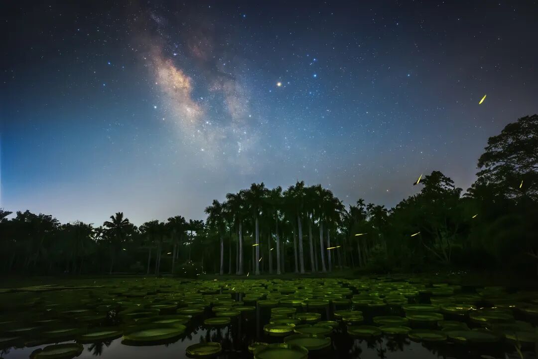 2022年5月底我来到了我国萤火虫数量最丰富的森林之一,中科院西双版纳热带雨林公园拍摄萤火虫,本就处于夏季的雨林,湿气很重,但是即使是这样,我们还是守到了夏季银心出现的时候。照片拍摄于王莲园区,王莲是我国最大的莲花,莲叶甚至可以让一个100斤以下的人站在上面。拍摄时候由于是后半夜,萤火虫基本已经休息,只有星星点点的黄光在王莲之上闪烁,犹如仲夏之舞。