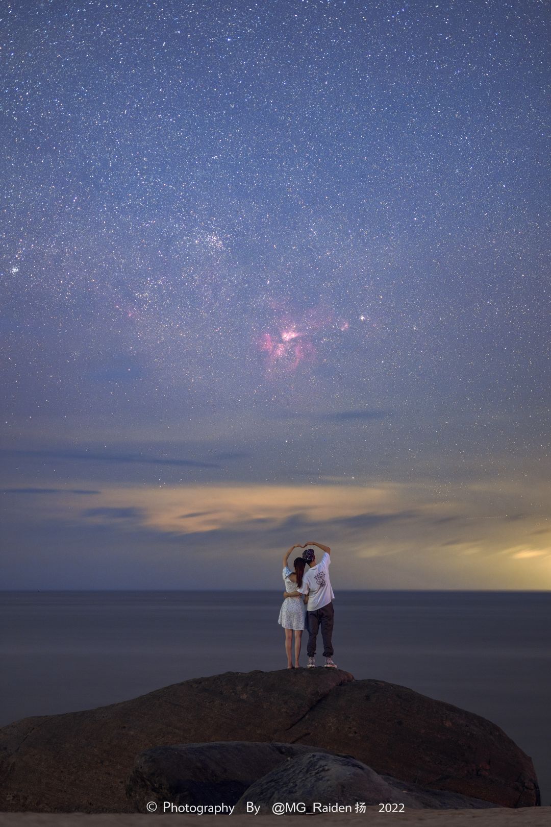 船底座大星云是天空中最大的弥漫星云之一。在天文相机的视角下,醒目的五片红色花瓣好似一朵悬在地平线上的紫荆花。在祖国的南端三亚,船底座大星云能达到的最大的高度有11.7°,位于南十字座的右边。如此浪漫的景色,我们兴奋地站在礁石上与它合影,又一张狗粮。