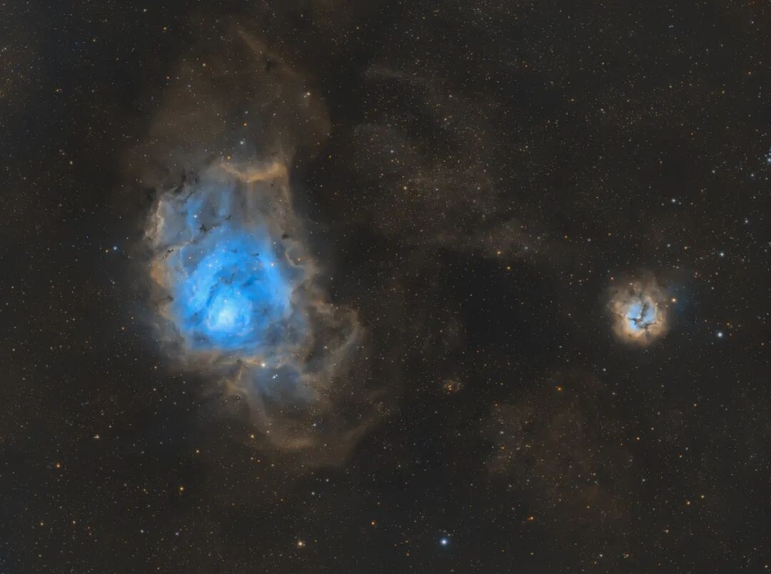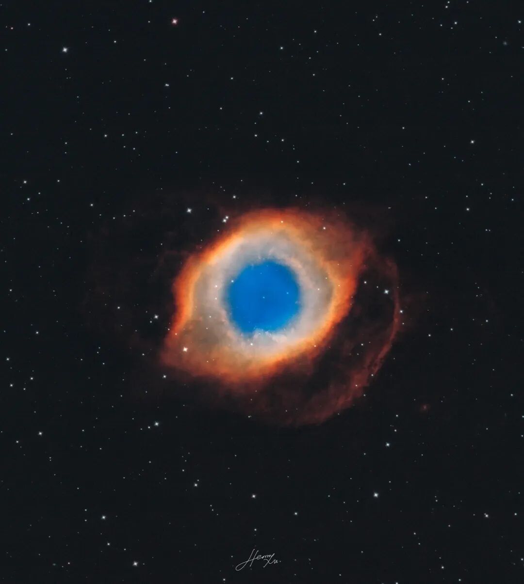 NGC7293是夜空中最大的行星状星云,也是最美的星云之一,它距离我们790光年,是由一颗昏暗的恒星向外抛射的物质形成的。这张窄带照片呈现了该星云中丰富的化学成分和大尺度结构,从星云一端发射光线到另一端,需要足足六年多的时间。