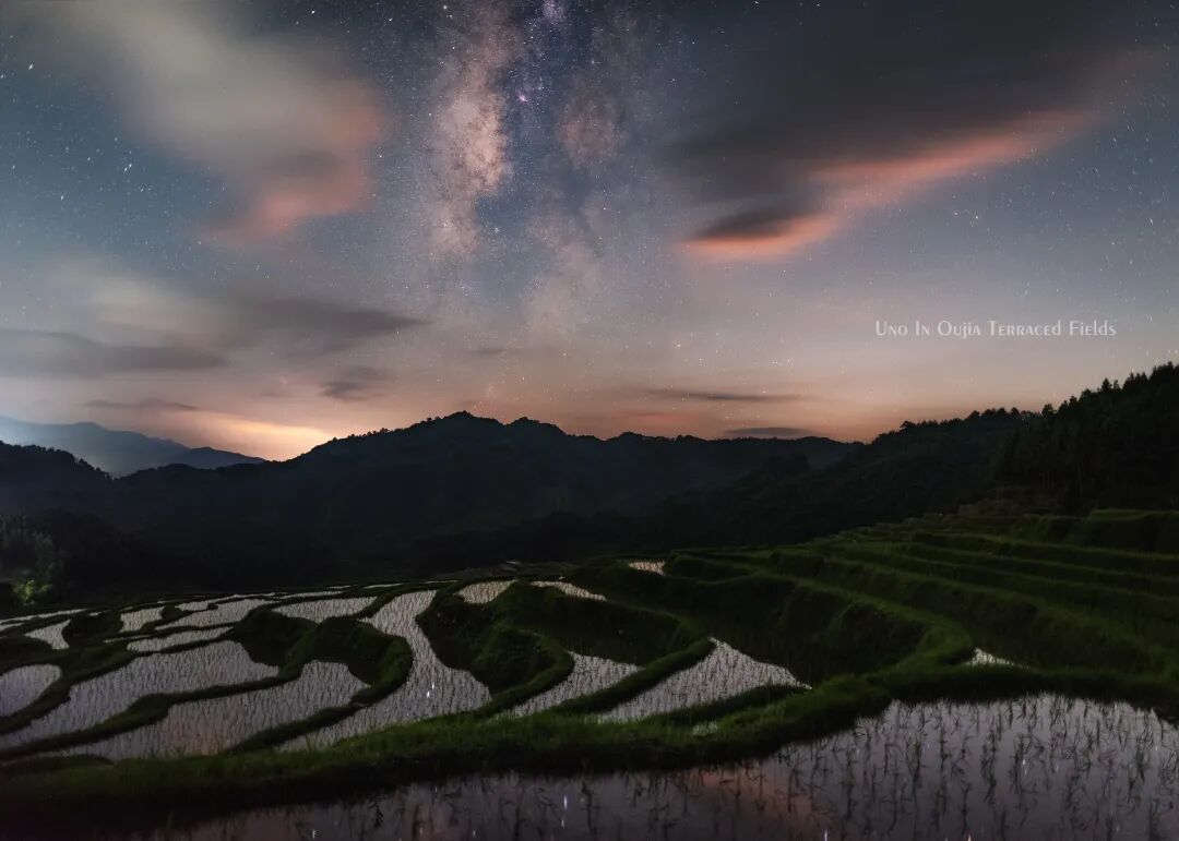 梯田星空,一直是想拍摄的目标,于是同小伙伴们一行人来到欧家梯田,当晚天气并不理想,夜里大部分时间有月光干扰,摆好相机就钻回了帐篷躺平,炎热的夏夜没有一丝微风略感闷热,田里的蛙叫声也此起彼伏,难以入睡。过了许久,月亮西落,云也散了许多,月亮的余辉映在些许云里,月落西南星河现,点点星光映梯田。