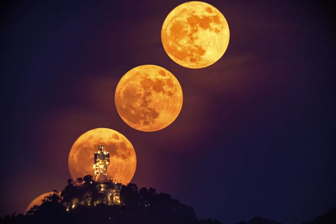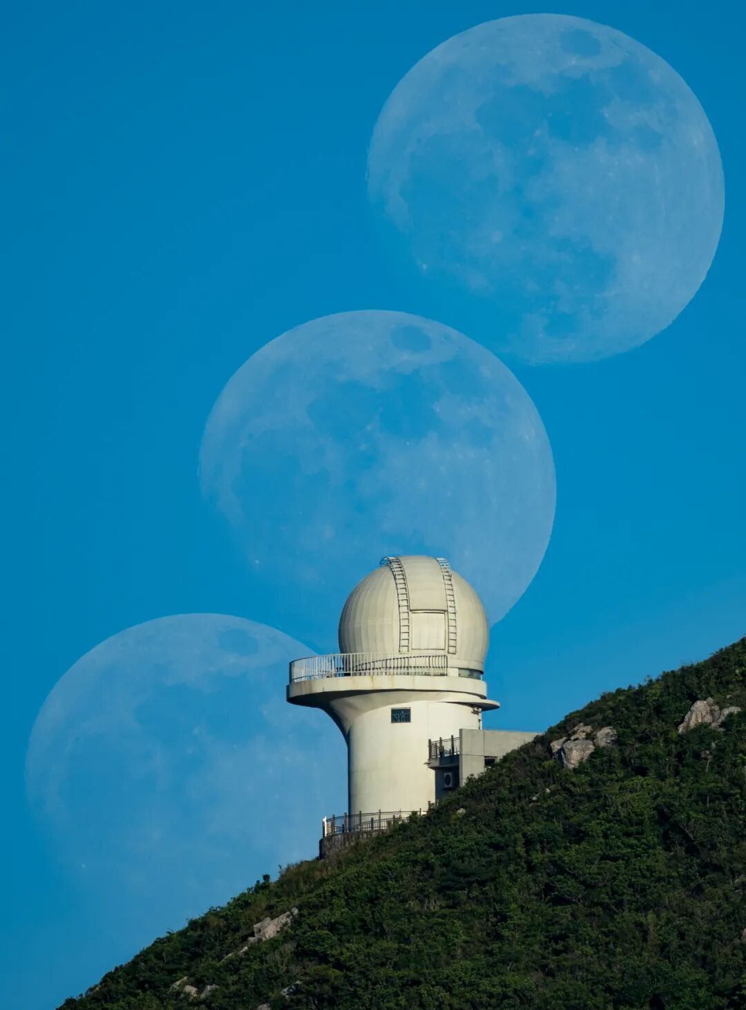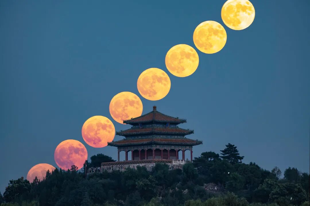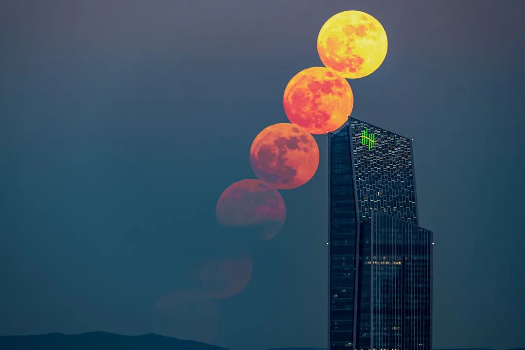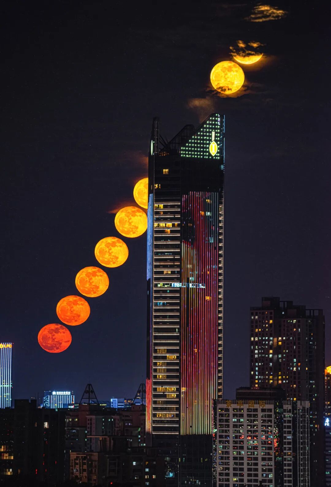 2022年最大的超级月亮,升起在昆明最高的恒隆广场上。从地平线处升起时,因为散射的红色光线多,所以看起来是红色的,升高以后慢慢变黄再变白,美轮美奂~