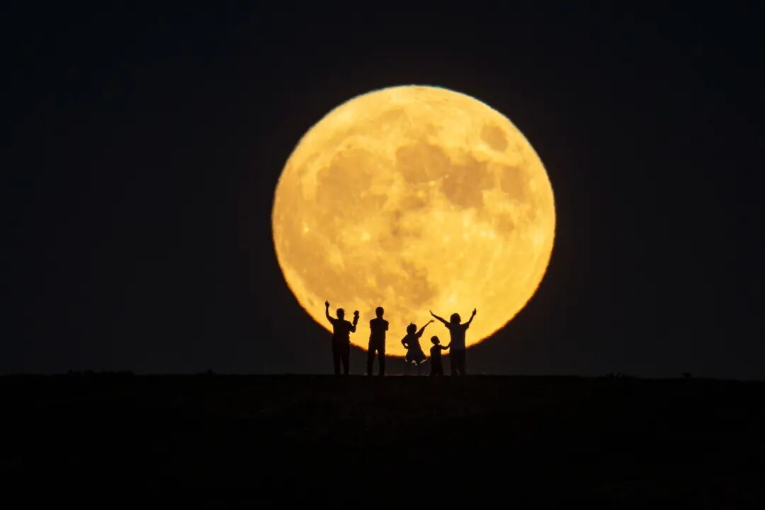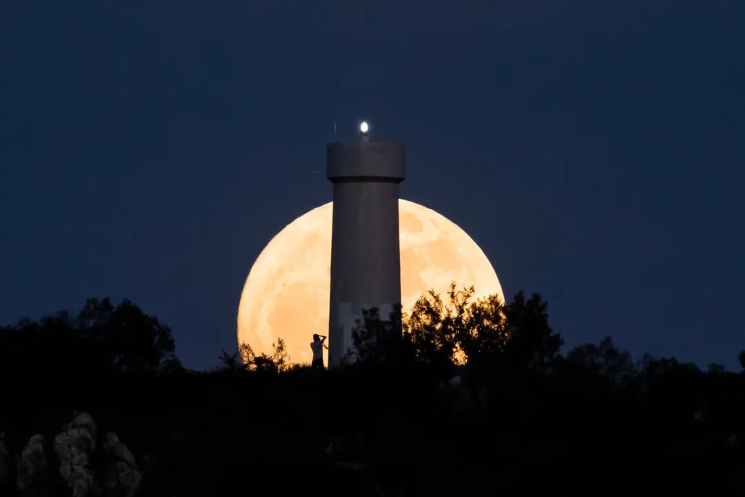 7月13日晚,一轮巨大的满月正从灯塔后方升起,在灯塔旁边,一名摄影师正在拍摄月亮。