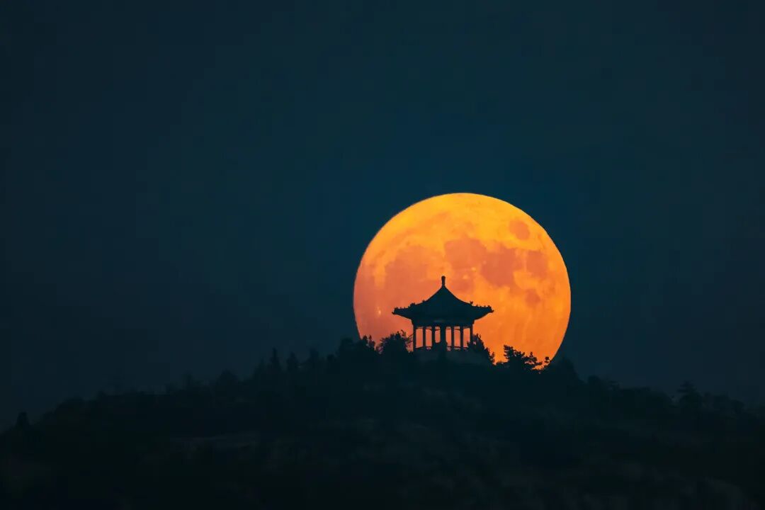 2022年7月13日晚上8点过,今年最大的超级月亮从山脊上升起,划过南山大金鹰的背后,升上夜空。