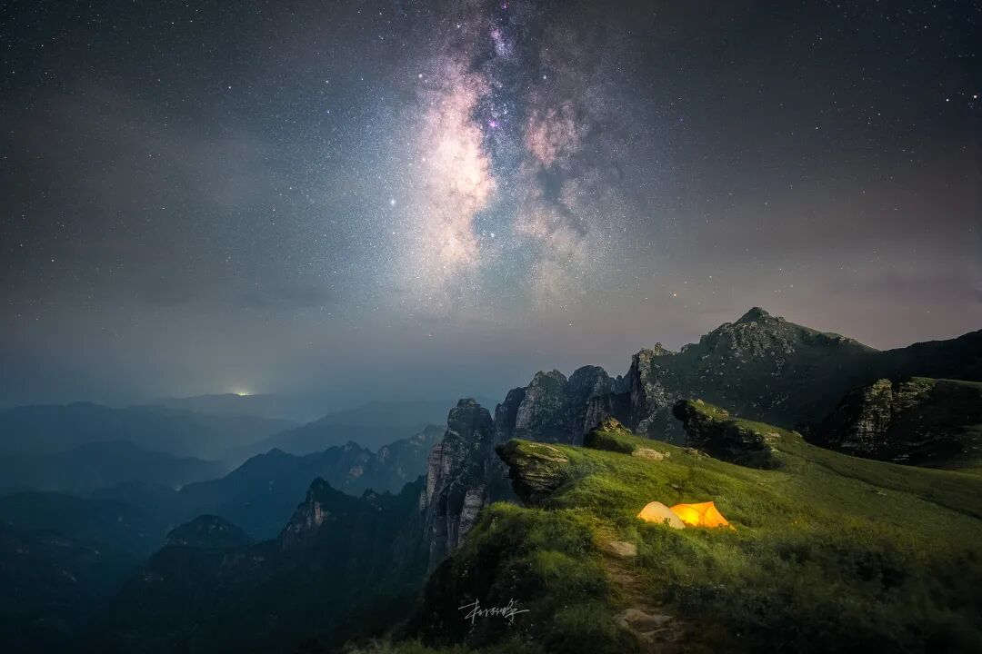 鹿角梁位于陕西秦岭地区深处,海拔2700米,人迹罕至,植被原始,号称“秦岭最后一片净土”。这里的山峰与断崖犬牙交错,冷杉林风骨峥嵘,大草甸山花烂漫,构成了绝佳的美景。周末重装徒步穿越30公里,经过一天的煎熬终于到达目的地。在月落后起云前的十几分钟内,幸运的拍到了银河竖立于山峰之上,此时,称得上是身在地狱,眼在天堂。