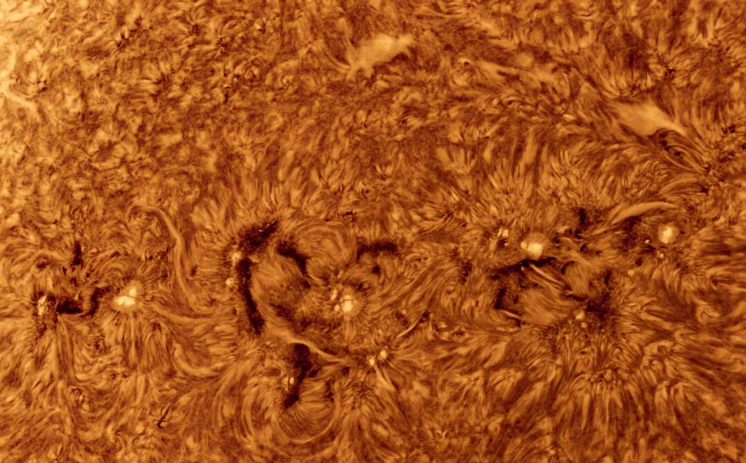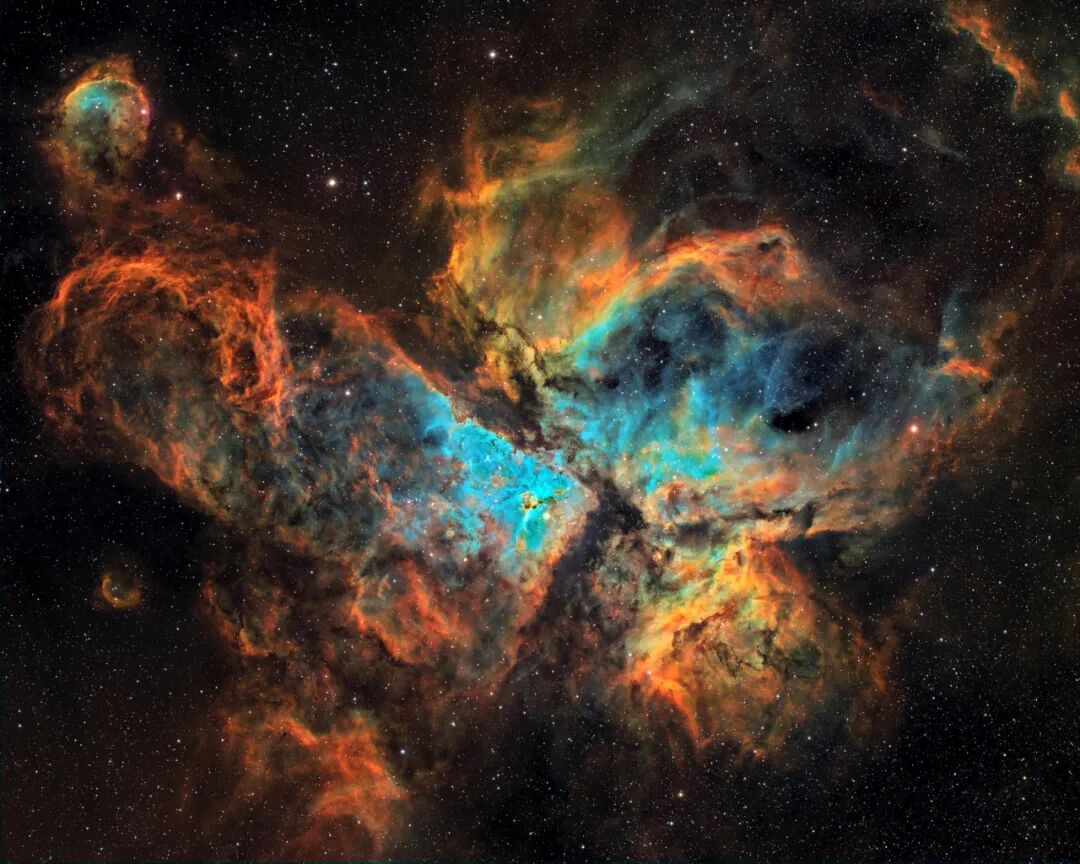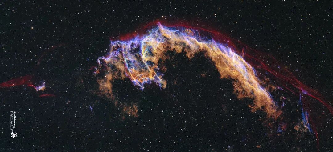 东面纱星云有着极其丰富的色彩和细节,既像五彩的丝衣又像熊熊燃烧的火焰。本图采用HSO配色,氢元素H-alpha为红色,硫元素Sii为绿色,氧元素Oiii为蓝色。