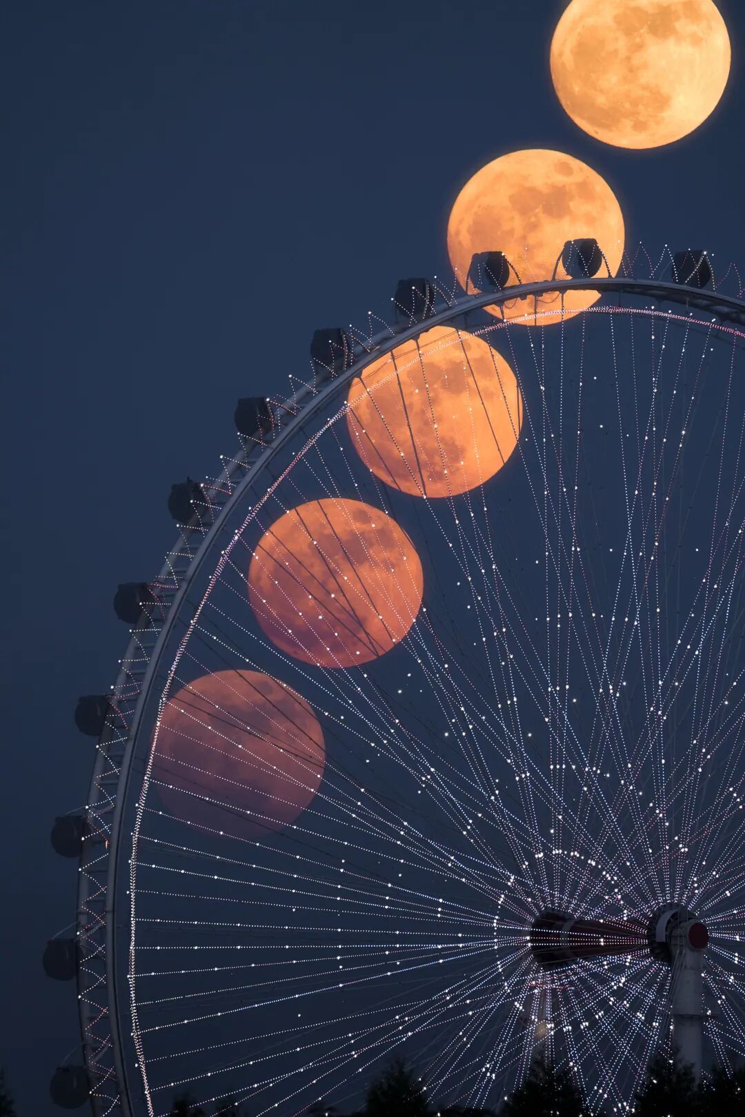 忘了有多久,没有坐过摩天轮了,可能长大后,儿时的期待已经变得不那么重要了,这一次超级月亮来临之际,我早早守候在巧摄算好的机位,等待着月亮升起。当超级月亮顺着摩天轮升起来之际,儿时的回忆涌上心头。