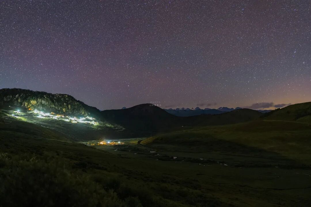 莲花生大师是藏传佛教宁玛派祖师,这座美丽的佛塔,是莲花生大师的坛城。夏季周围的草地上会开满一种叫做狼毒花的小花。月亮落山后,漫天的气辉与垂直的银河相辉映。